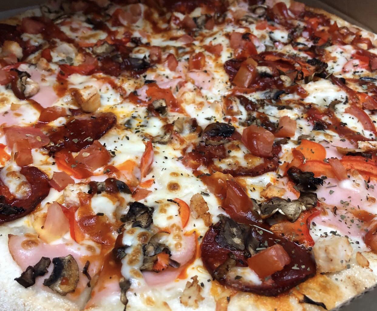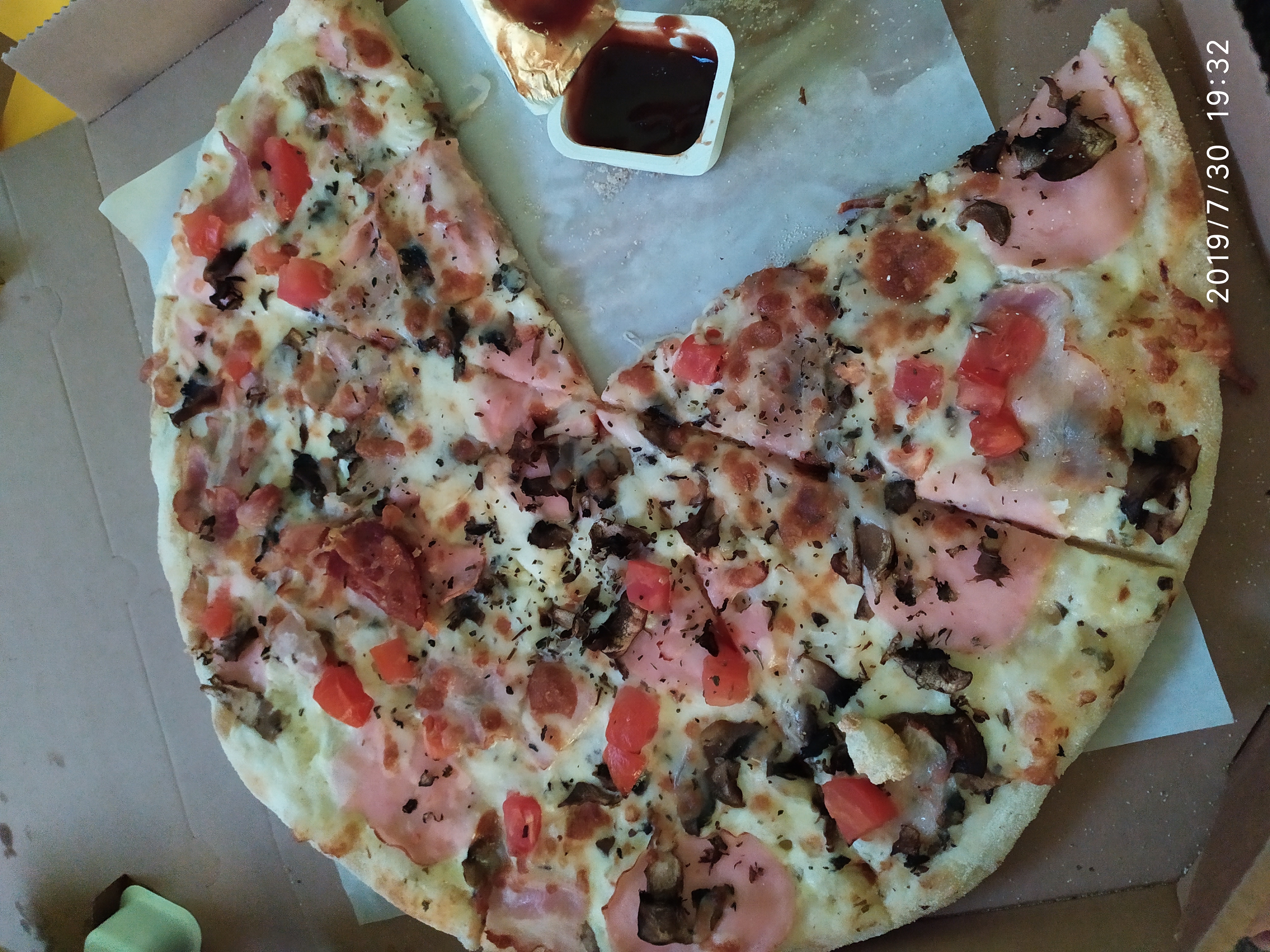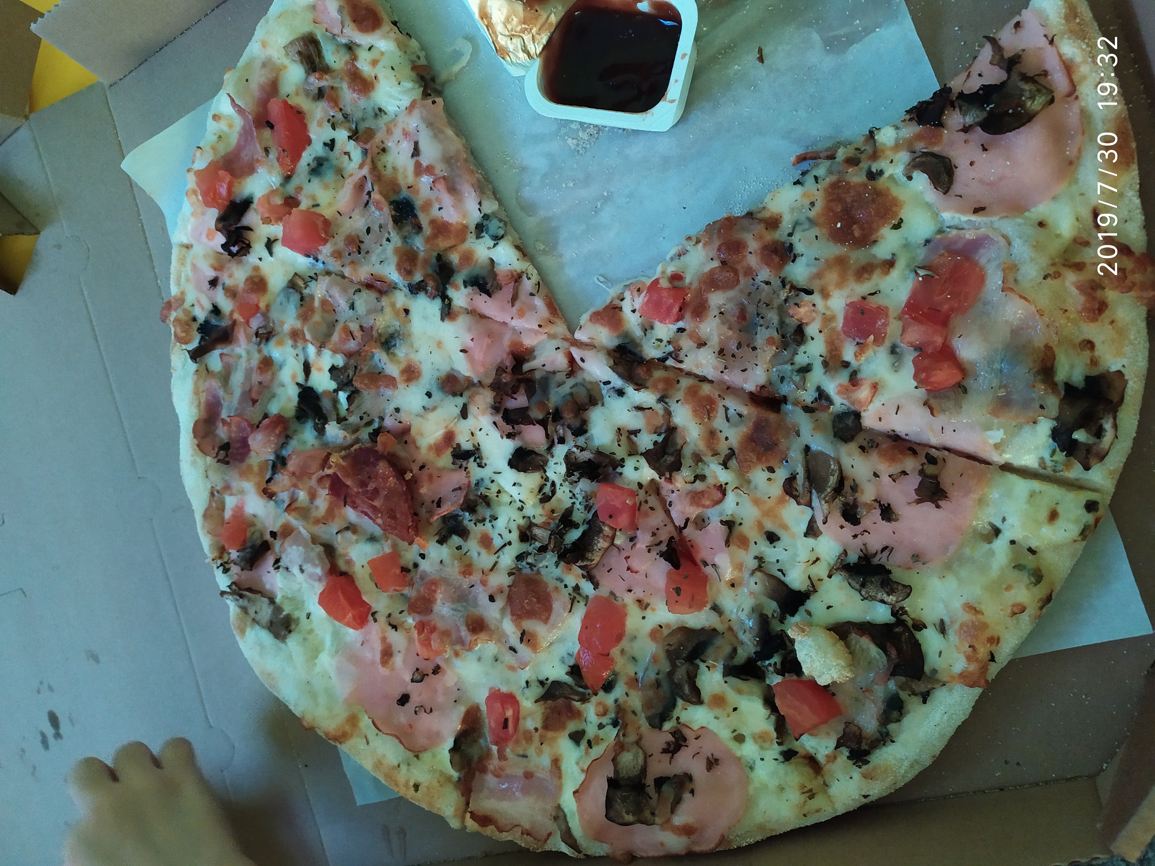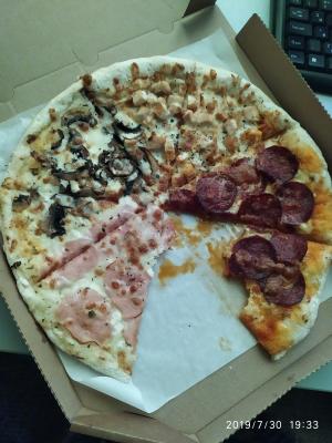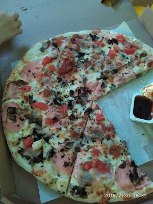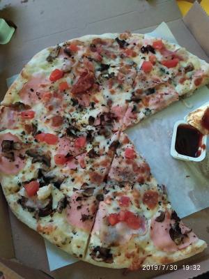 Доставка действительно быстрая. Пицца горячая. Начинки много. Есть единственный минус. Тесто каталось не на муке, а на манке. Это наверное хит сезона. Мне очень не нравится. Исключая это ,пицца вкусная. От картинки отличается. На мем фото карбонара, не считая пару кусочков и 4сезона.грибы и базилик везде подгорели. Поэтому лучше делать как на картинке. И ещё одно пожелание, ложите побольше салфеток. Для большой пиццы три салфетки это мало. Ребята не жмыльтесь ведь они копейки стоят, у вас они даже не брендированы.