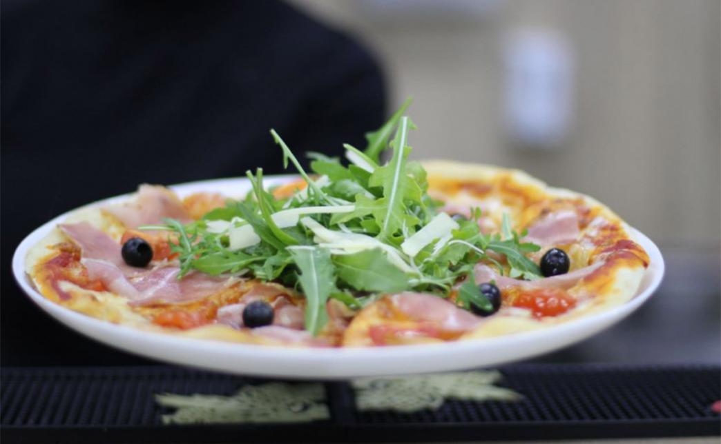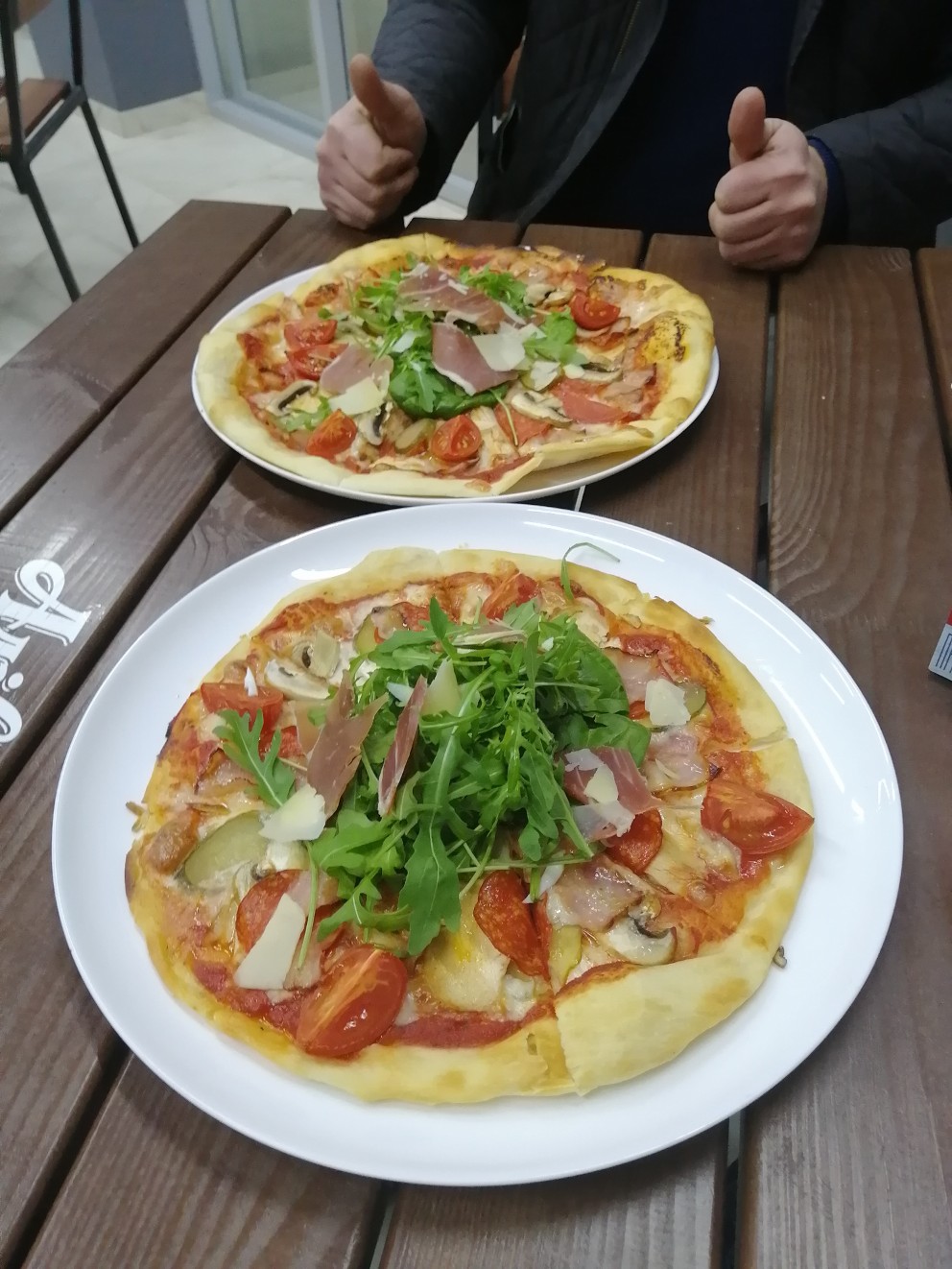 Состав: пицца-соус, моцарелла, прошутто, пармезан, томаты, маслины, руккола