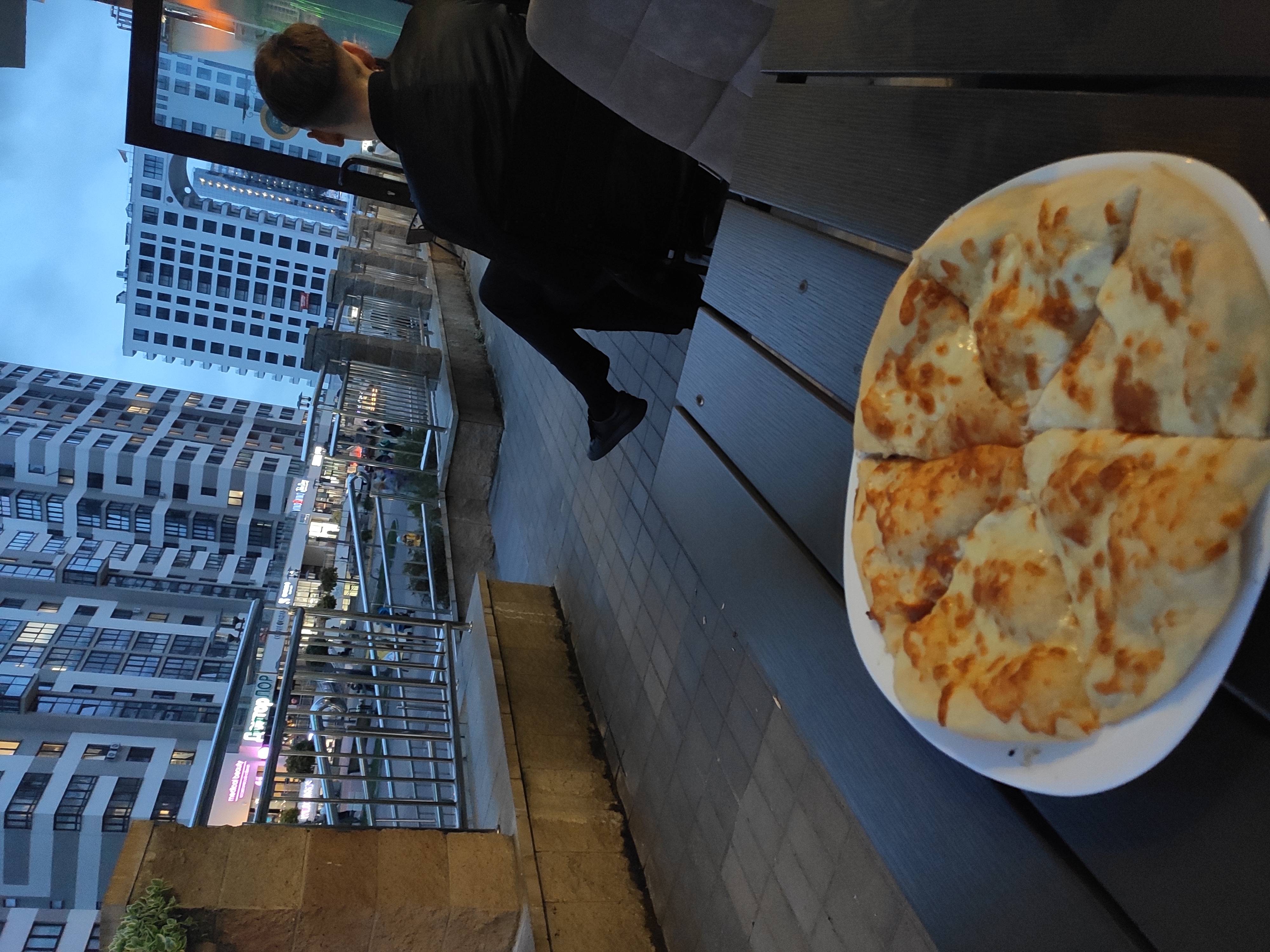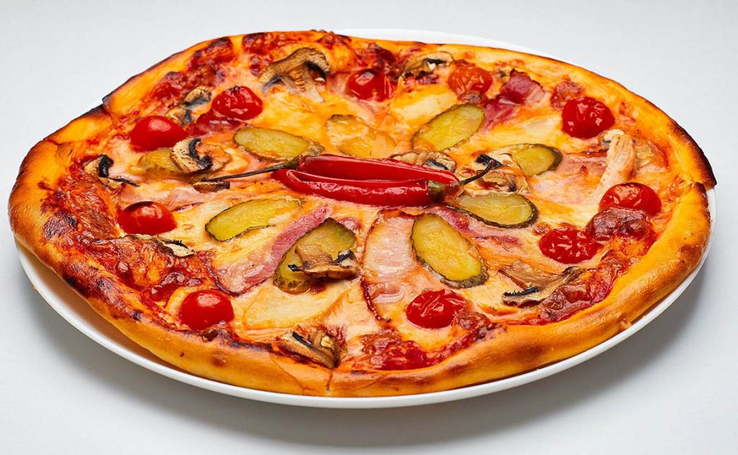 Состав: пицца-соус, моцарелла, куриное филе, бекон, перец чили, шампиньоны, черри, огурец маринованный
