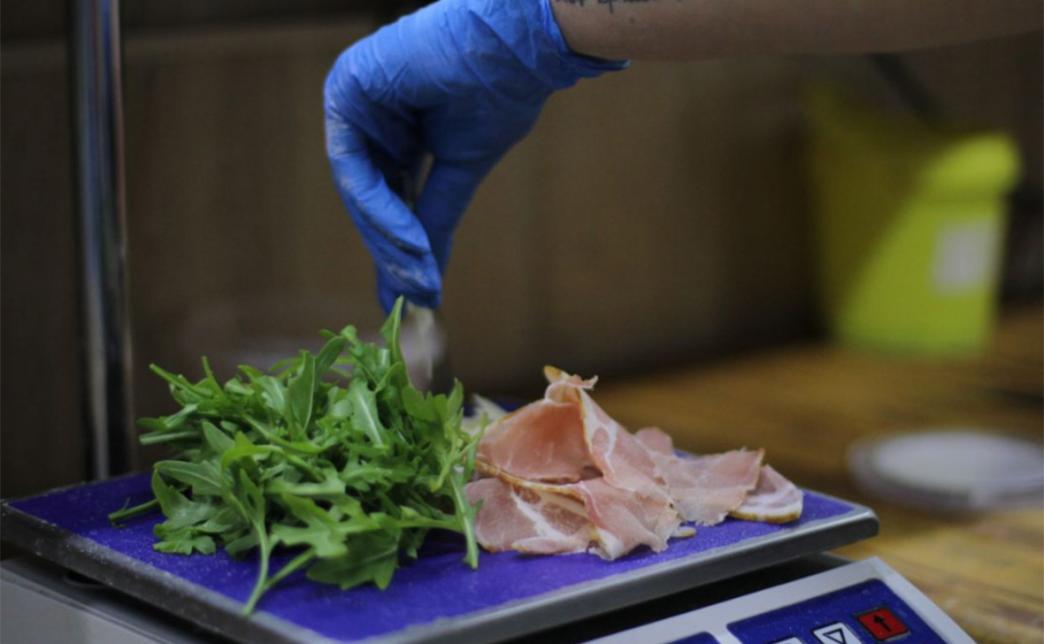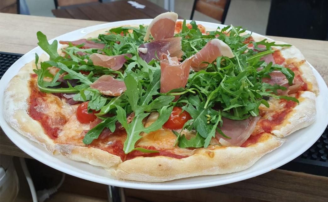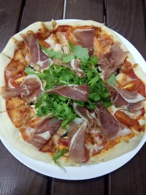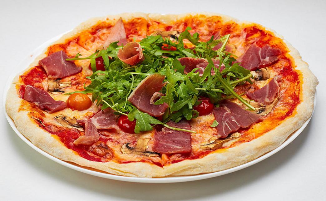 Состав: пицца-соус, моцарелла, прошутто, шампиньоны, томаты, руккола
