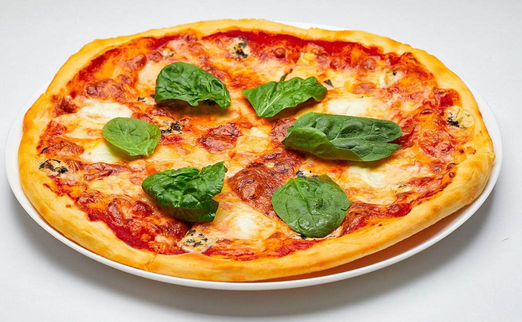 Состав: пицца-соус, моцарелла, пармезан, дор блю, белая моцарелла, шпинат