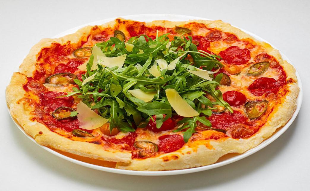 Состав: пицца-соус, моцарелла, пепперони, томаты, халапеньо, пармезан, руккола