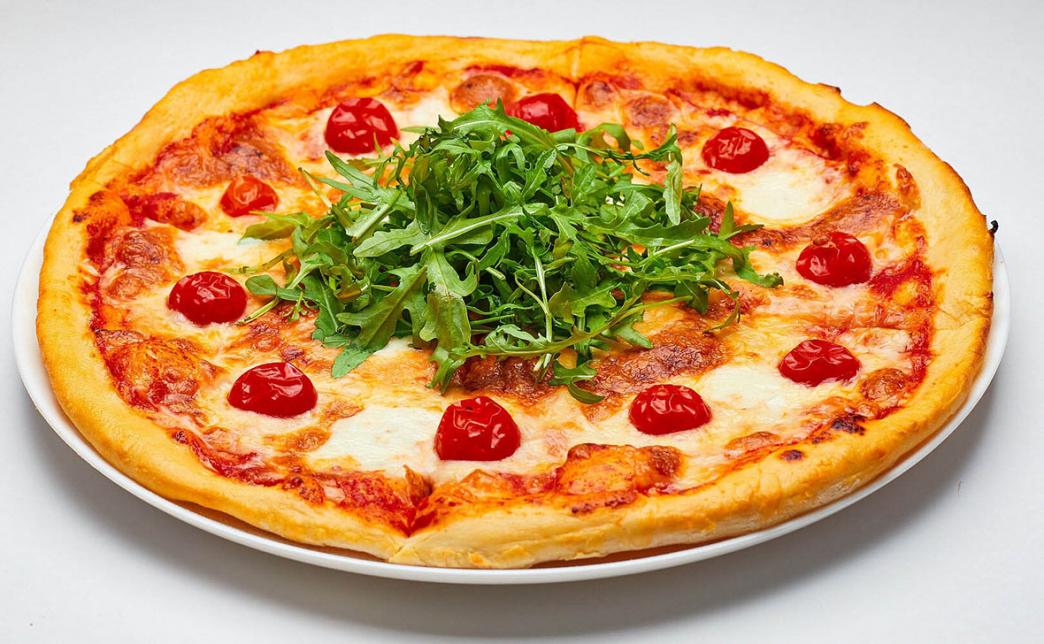 Состав: пицца-соус, моцарелла, белая моцарелла, томаты, маслины, руккола