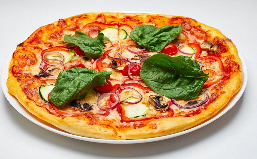 Состав: пицца-соус, моцарелла, шампиньоны, цукини, перец, томаты, лук, шпинат