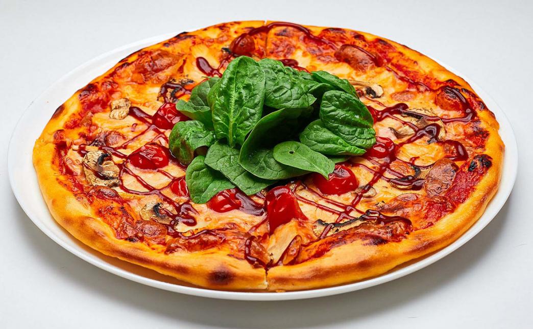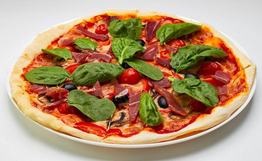 Состав: пицца-соус, моцарелла, прошутто, шампиньоны, перец, томаты, маслины, шпинат