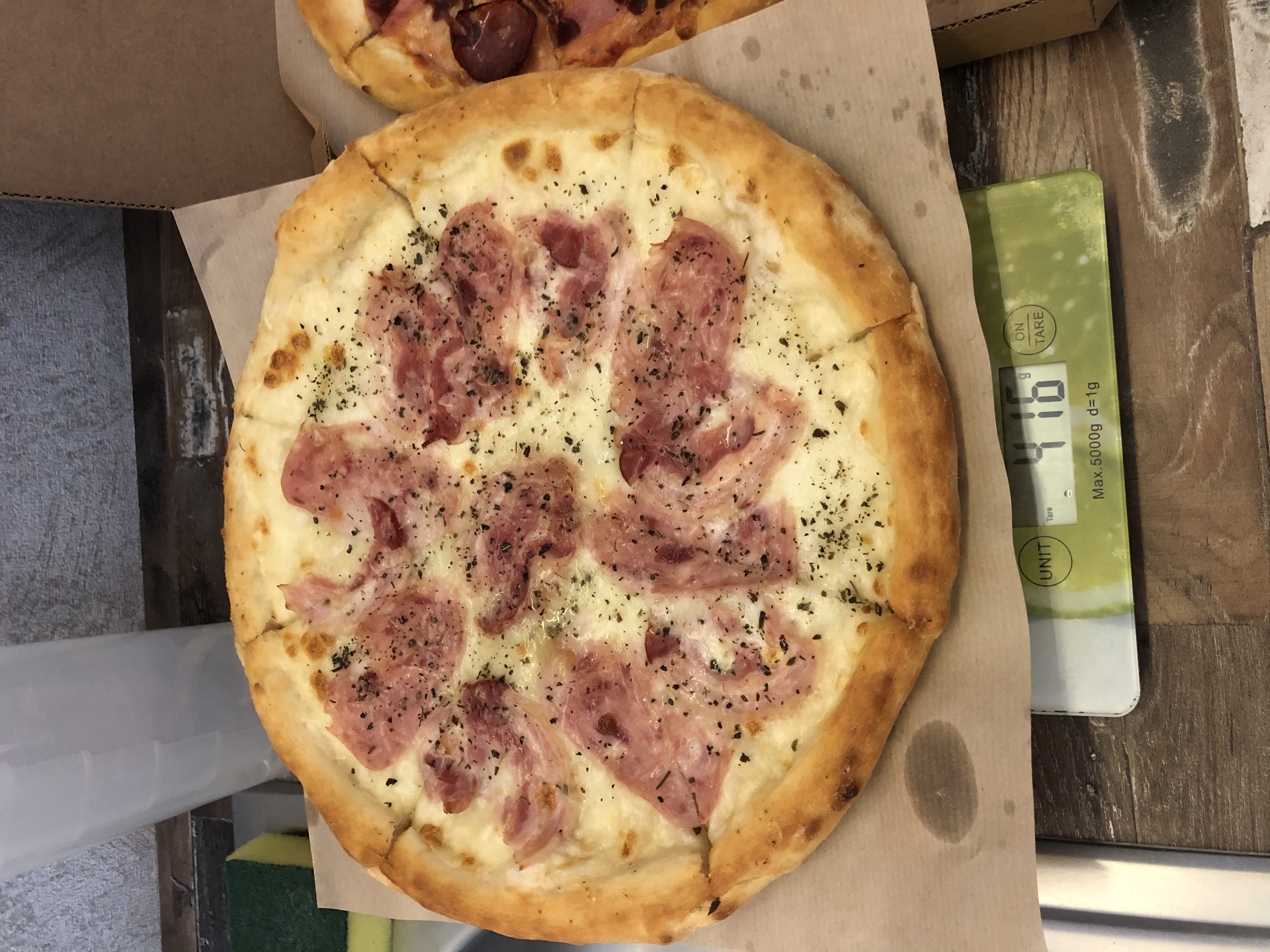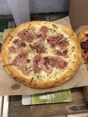 Состав: ветчина, бекон, томат, шампиньон, маринованный лук, пармезан