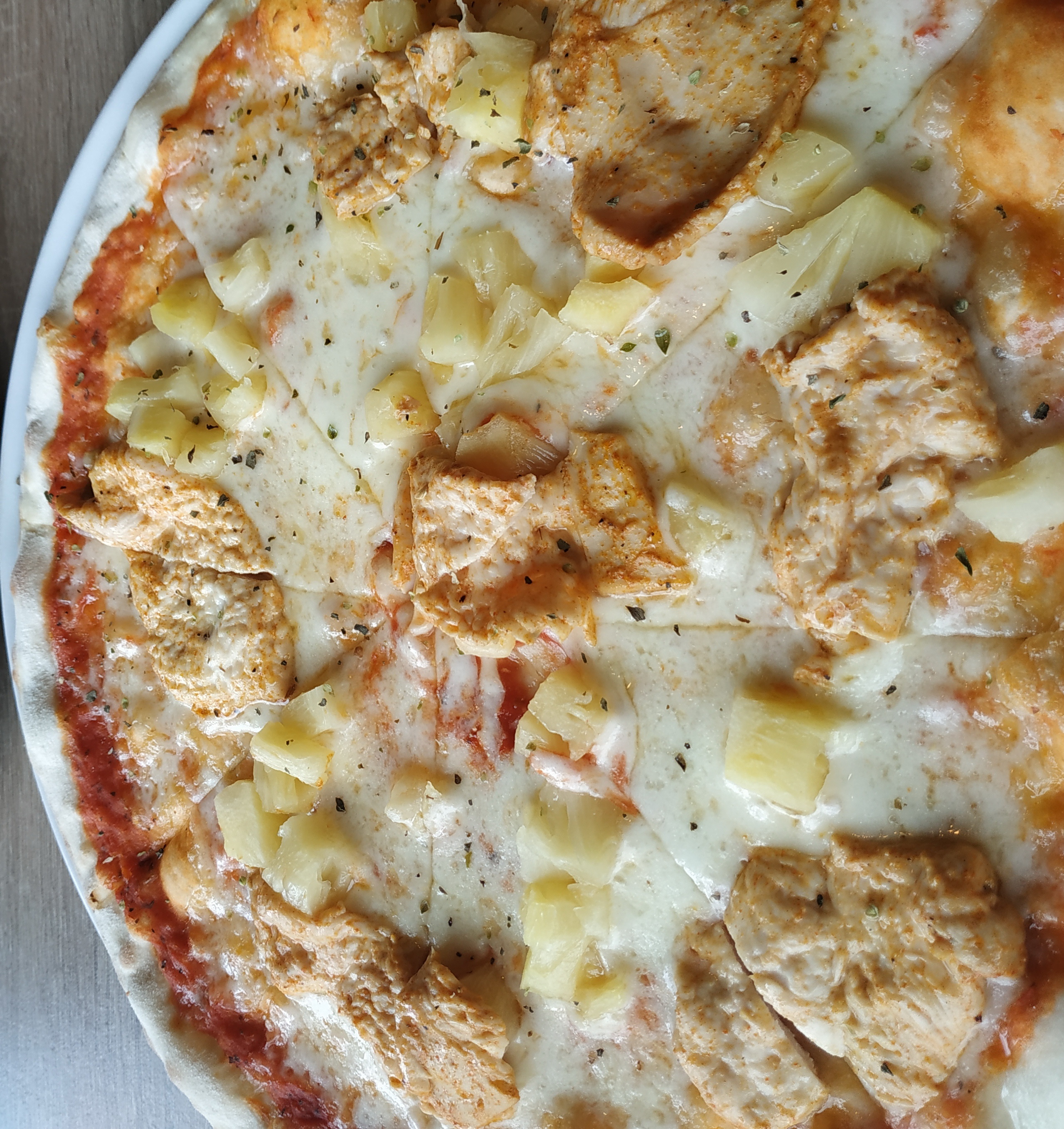 соус из протертых томатов, сыр Моцарелла, ветчина, консервированные ананасы, приправа к пицце, чесночное масло