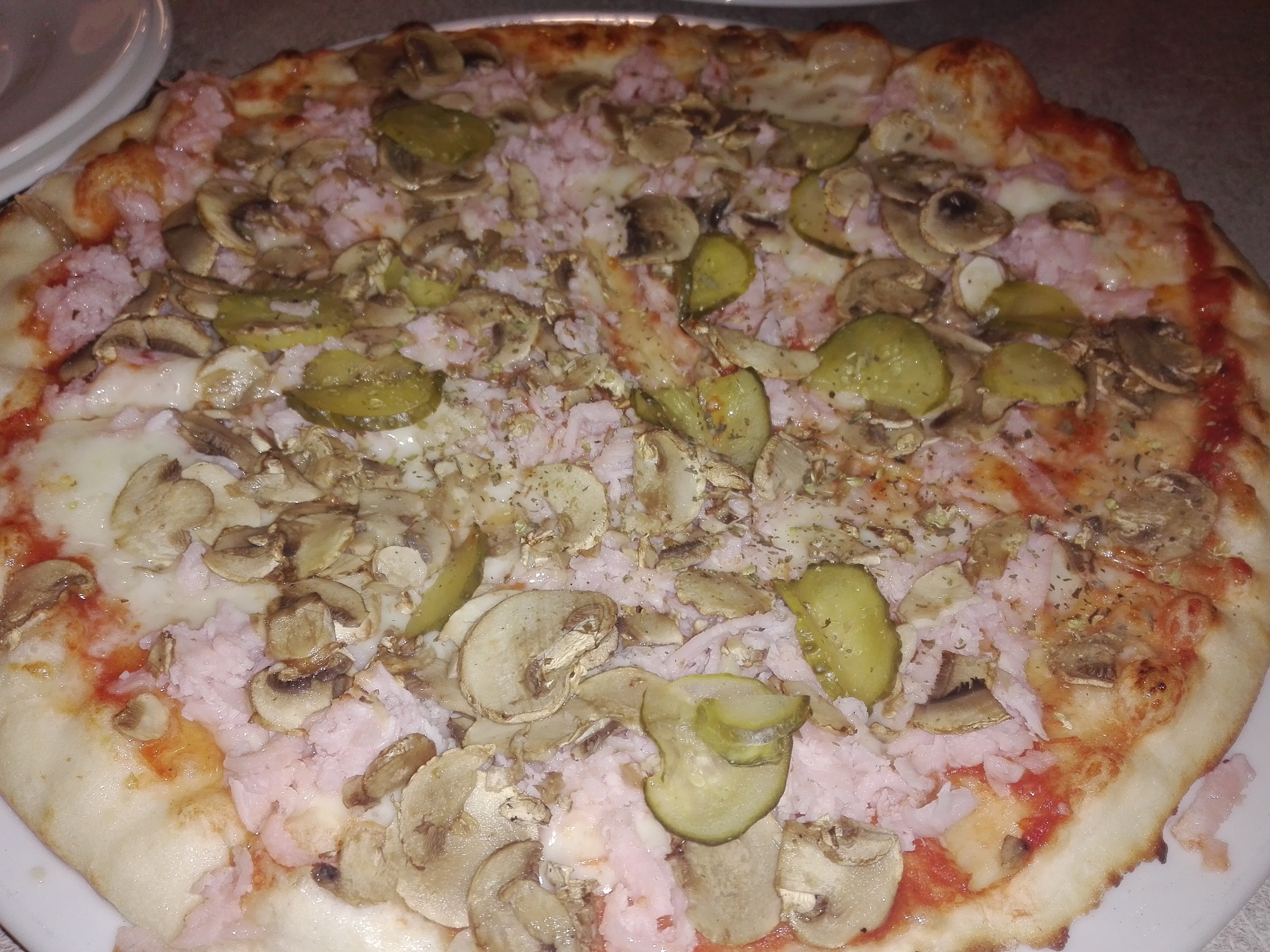 соус из протертых томатов, сыр Моцарелла, ветчина, шампиньоны, маринованные огурцы, приправа к пицце, чесночное масло