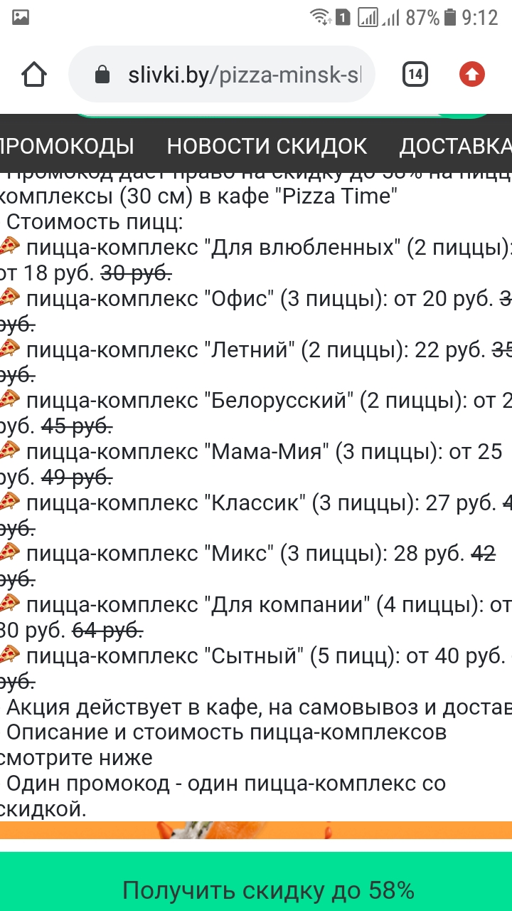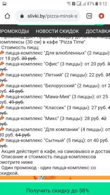 - Промокод дает право на скидку до 60% на пиццу и пицца-комплексы (30 и 40 см) в кафе "Pizza Time" ежедневно