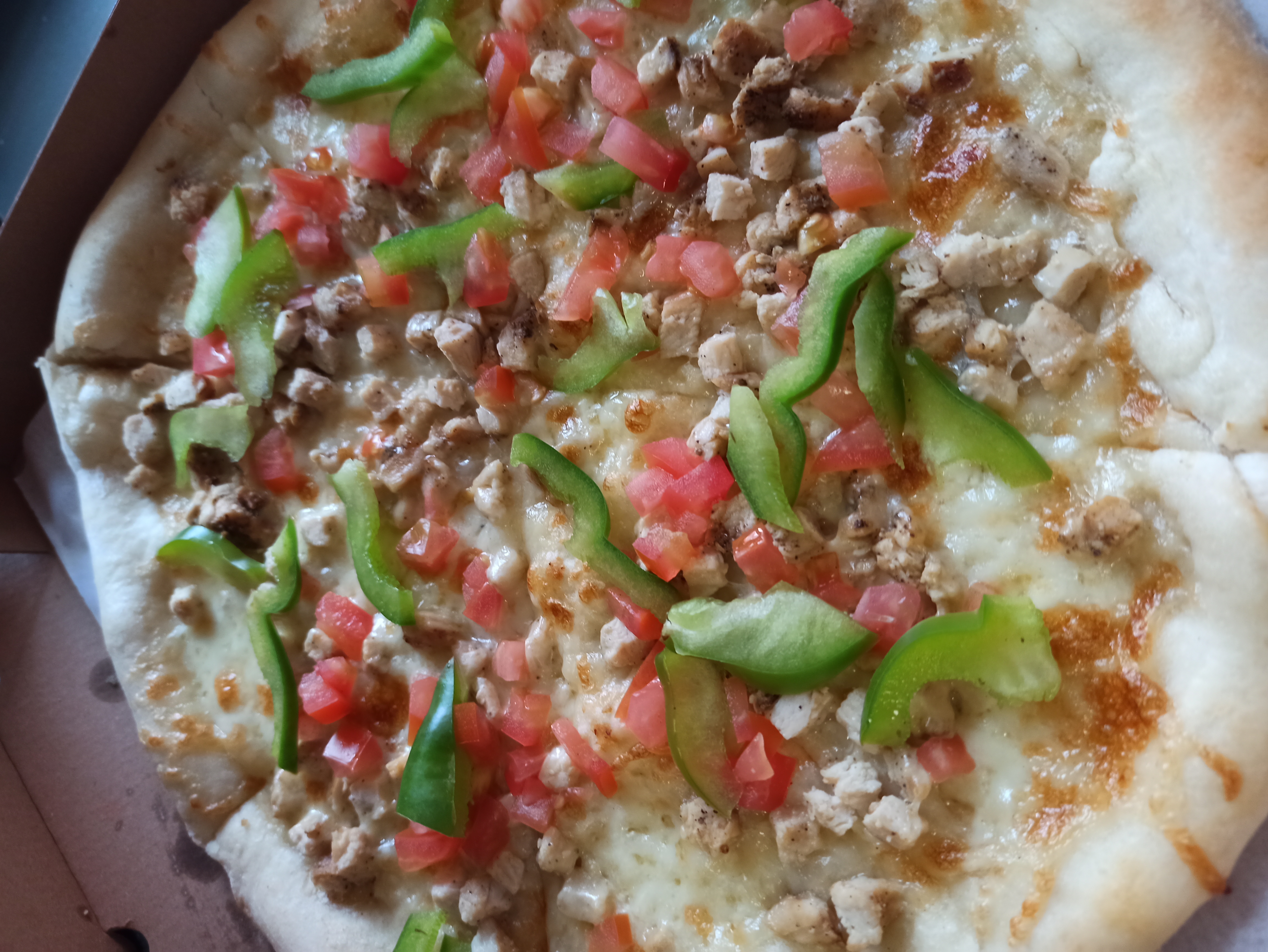 Состав: сыр моцарелла, куриное филе, перец болгарский, ананас.