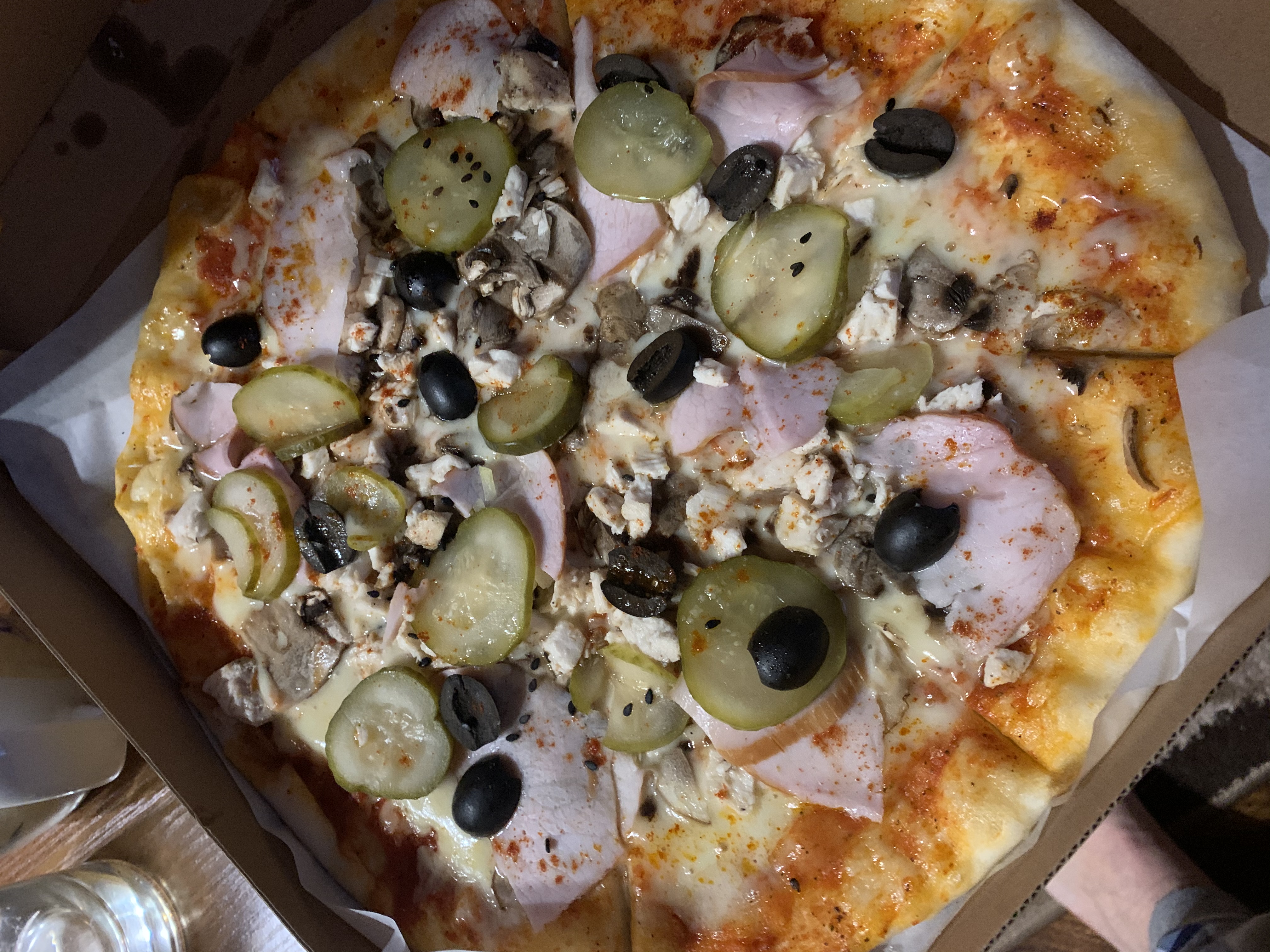Состав: сыр моцарелла, ветчина, куриное филе, шампиньоны, маслины, огурцы маринованные.