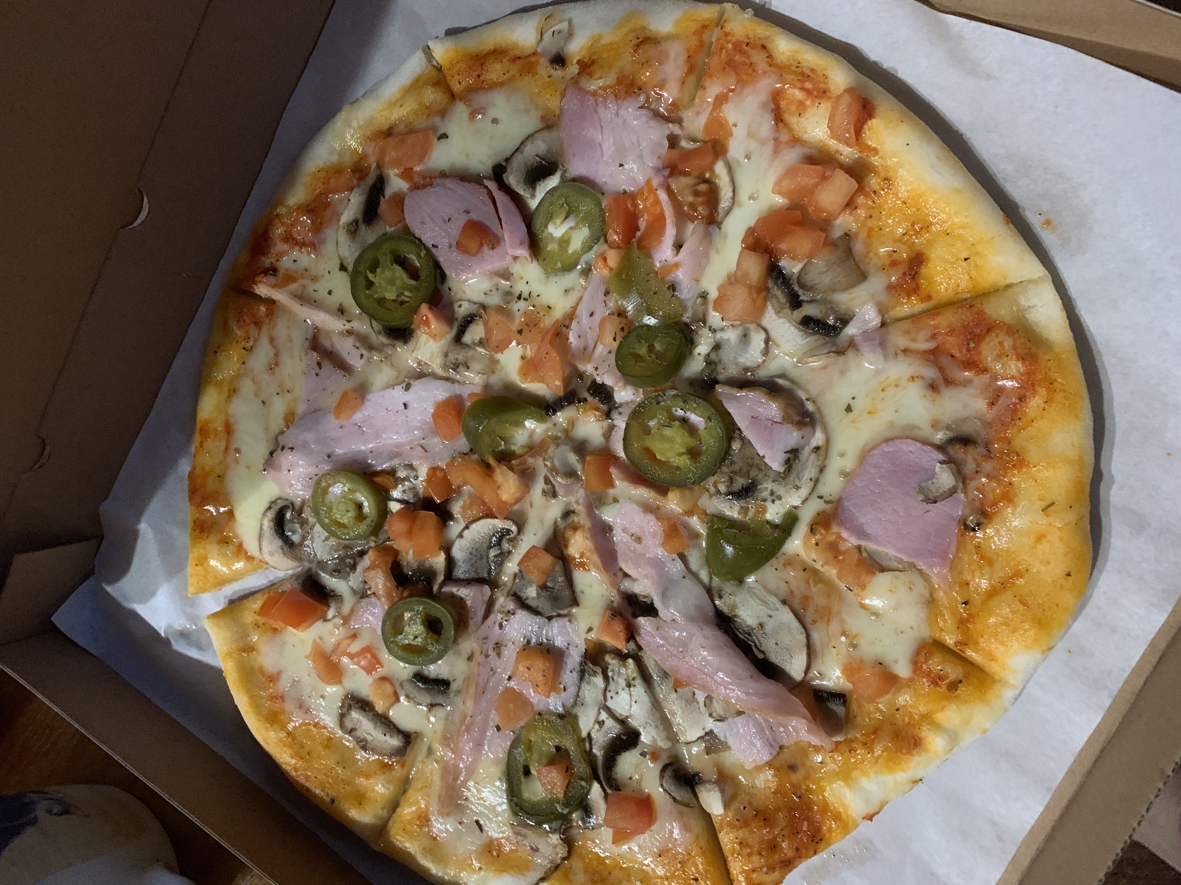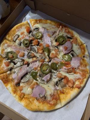 Состав: сыр моцарелла, колбаски пепперони, ветчина, томат, шампиньоны.