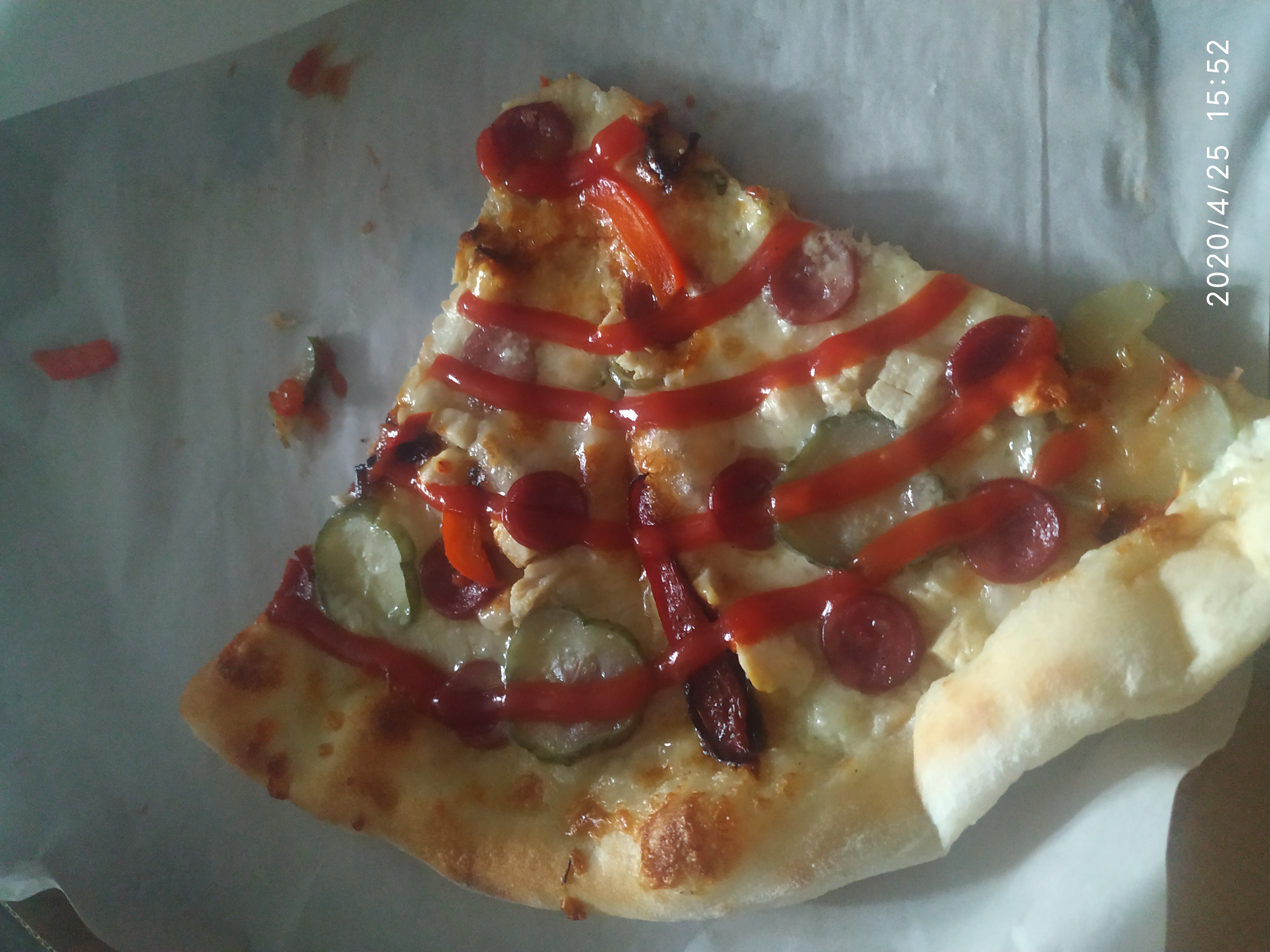 - Пицца "Деревенская" (30 см, сыр моцарелла, соус ранч, ветчина, куриное филе, огурчики маринованные, масло чесночное)