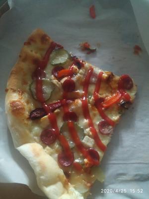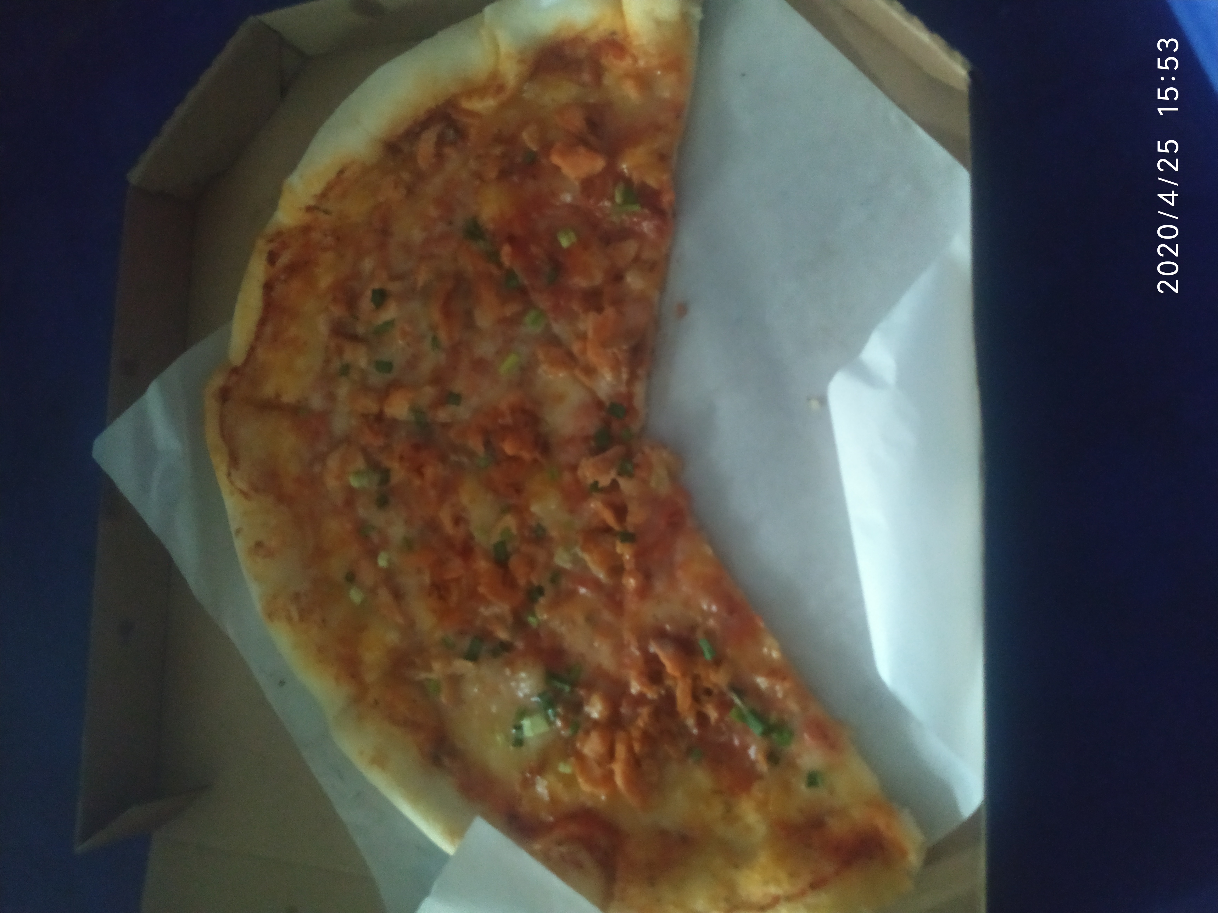- Пицца "Прадо" (30 см, сыр моцарелла, колбаски пепперони, ветчина, огурец маринованный, луковая посыпка, чесночное масло).