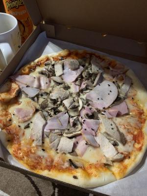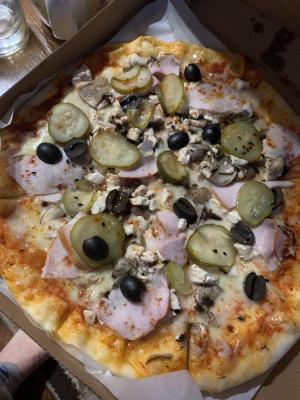 - Пицца "Pizza Time" (30 см, сыр моцарелла, ветчина, куриное филе, шампиньоны, маслины, огурцы маринованные, чесночное масло).