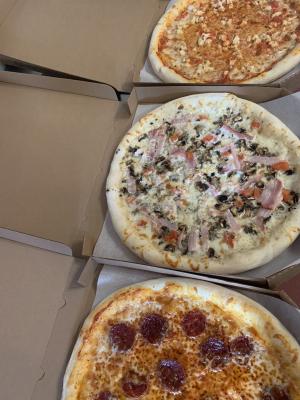 - Пицца "Лиони" (30 см, сыр моцарелла, соус чесночный, колбаски пепперони, ветчина, шампиньоны, чесночное масло).