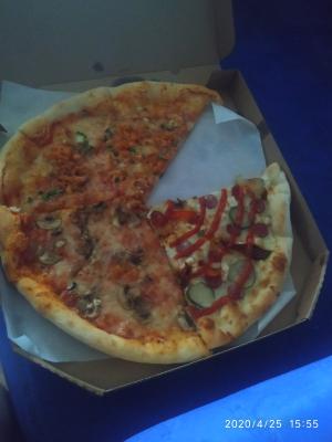 - Пицца "4 сезона" (30 см, сыр моцарелла, колбаски пепперони, ветчина, томаты, шампиньоны, чесночное масло)