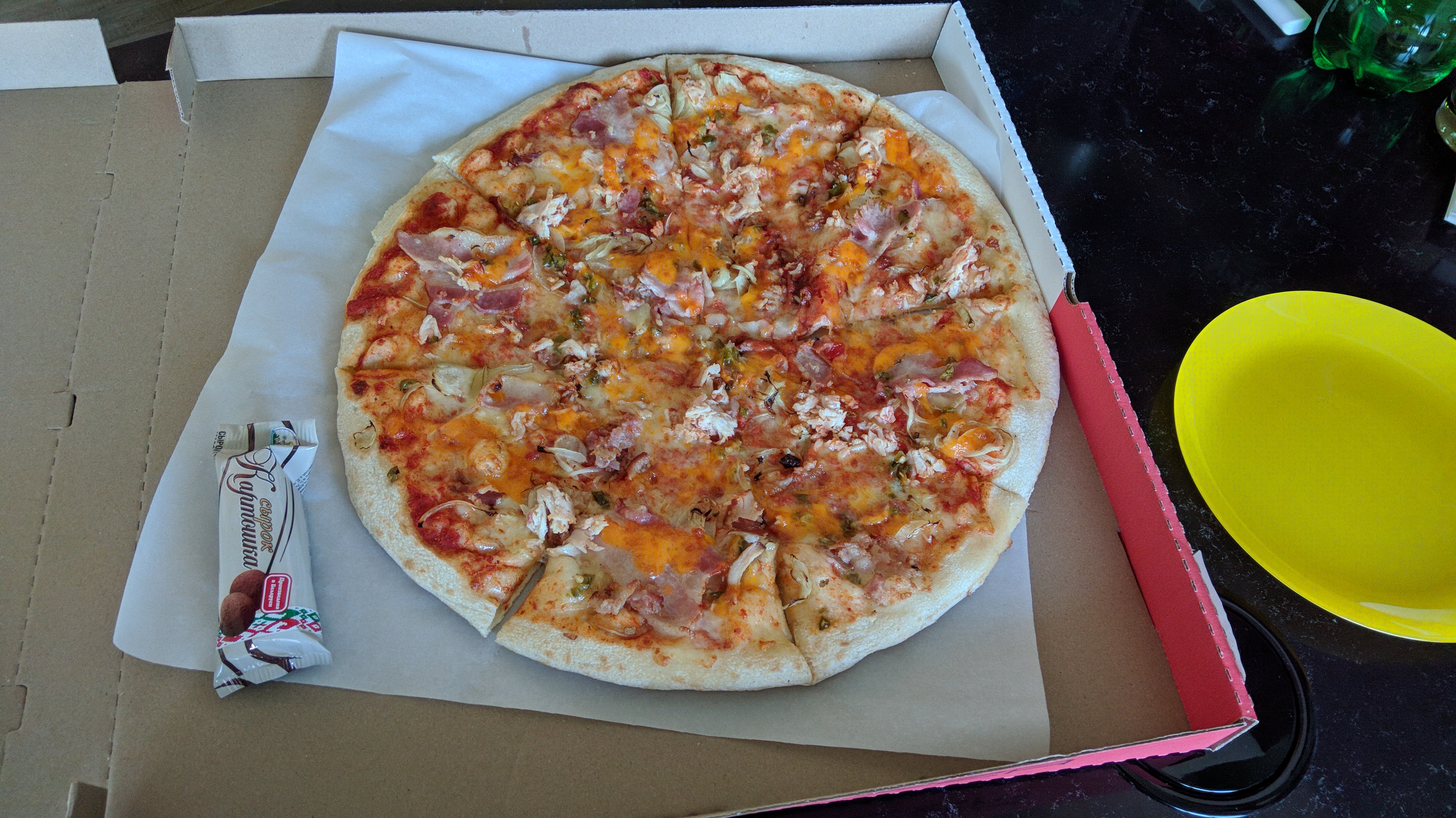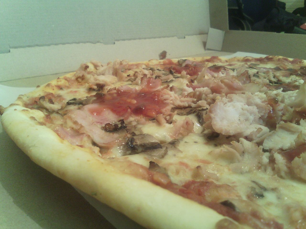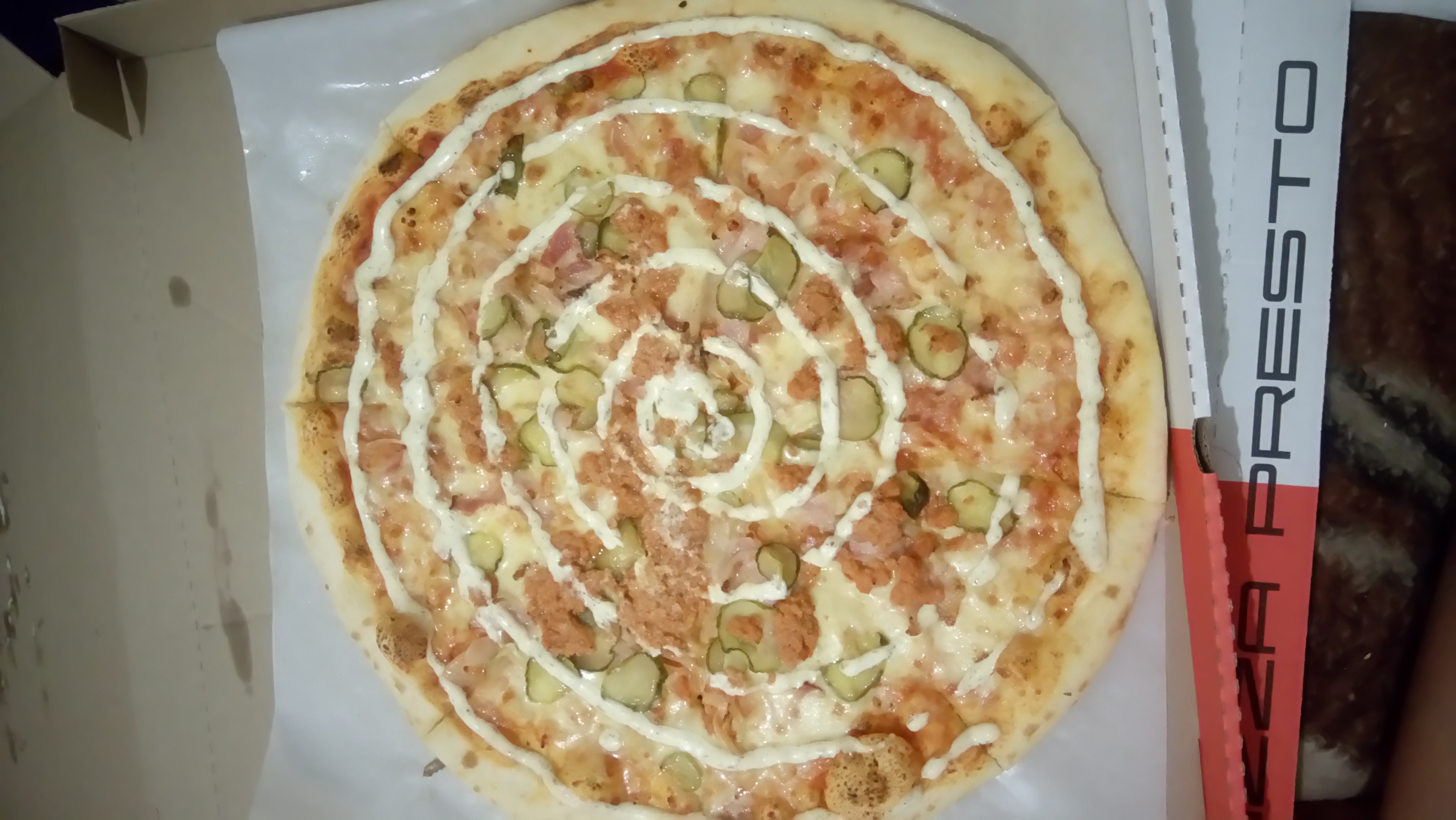 Сегодня с друзьями на работе захотелось остренького. Заказали пиццу Чикен-бекон. Очень-очень вкусно)
