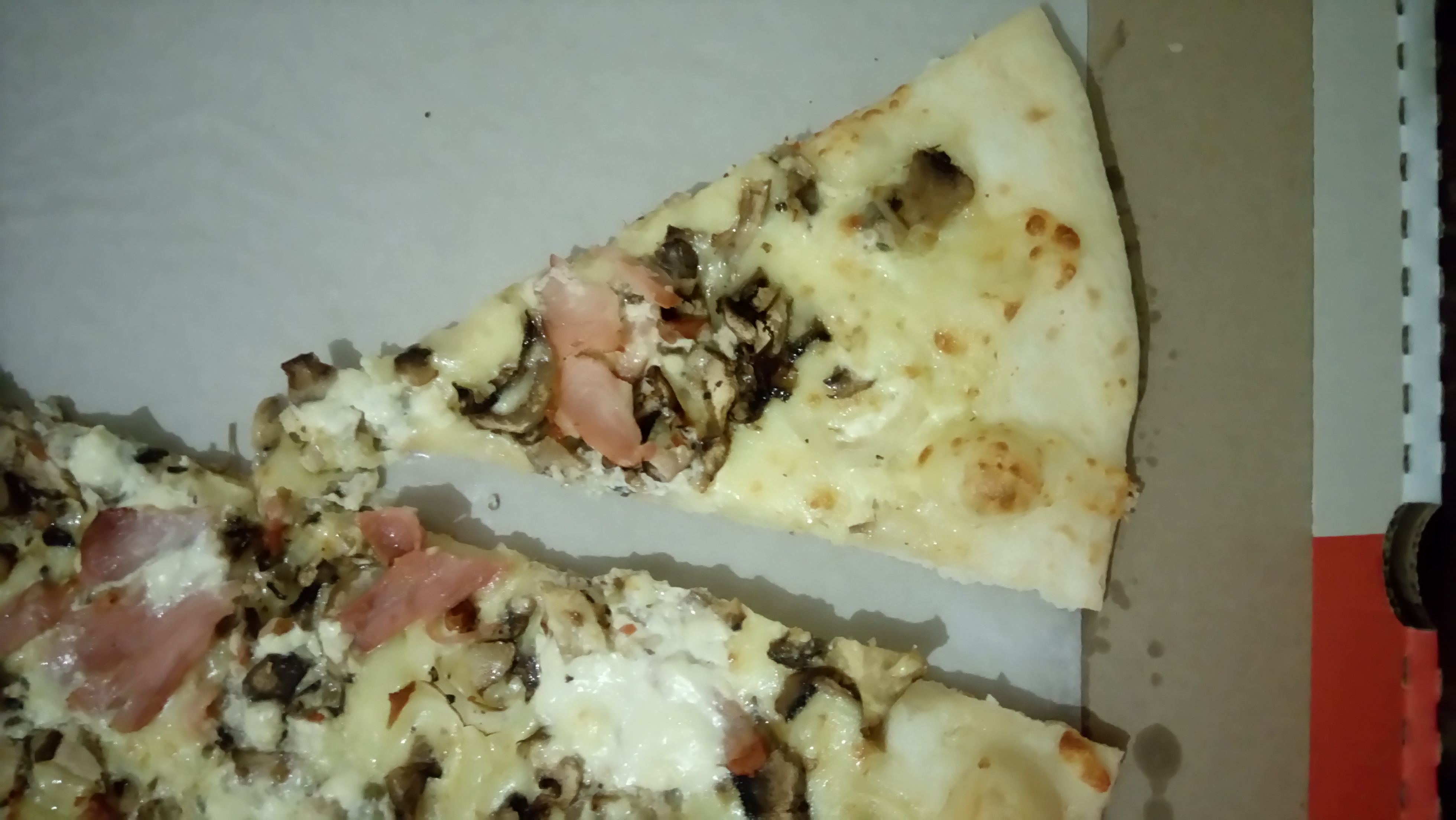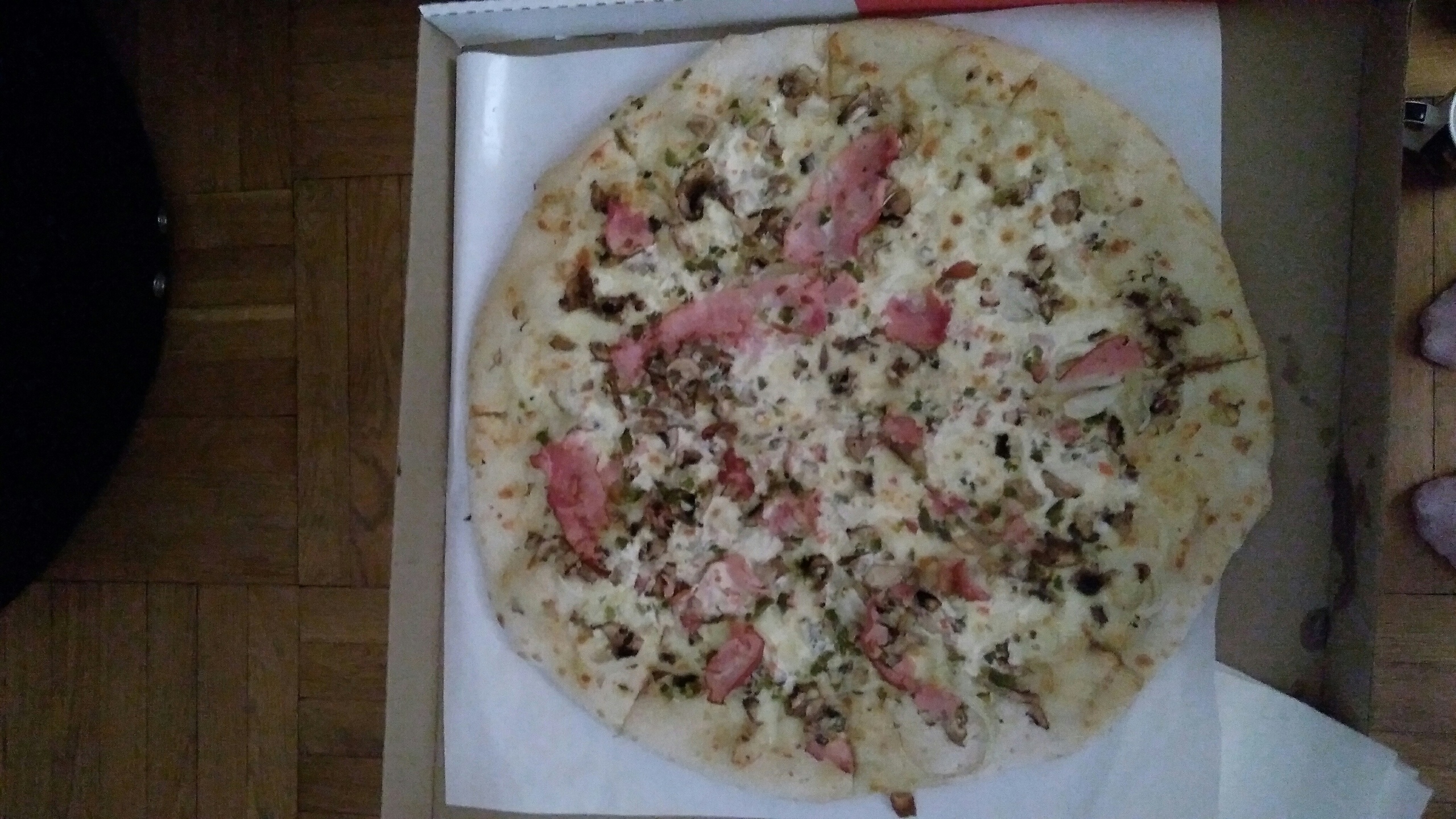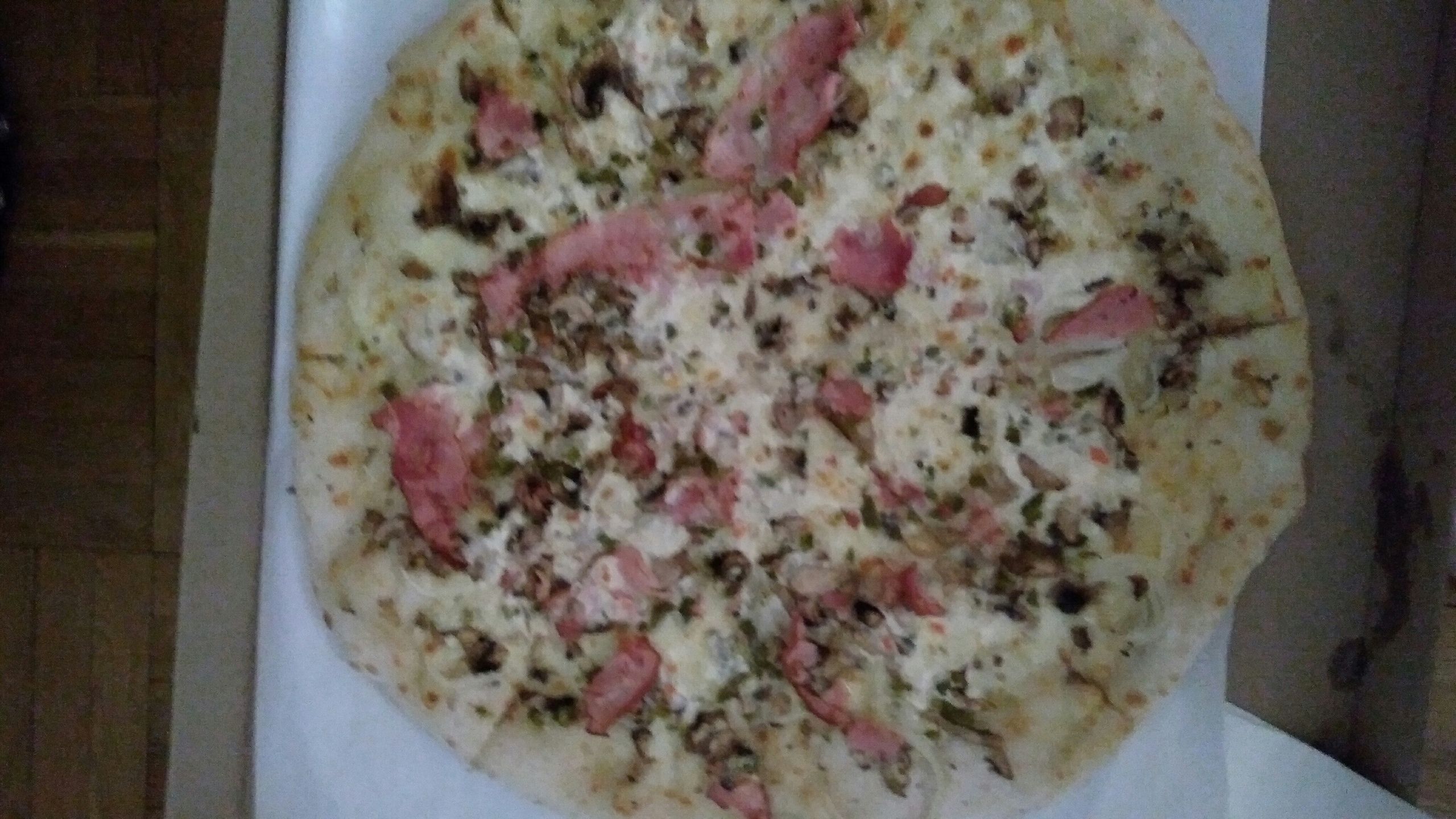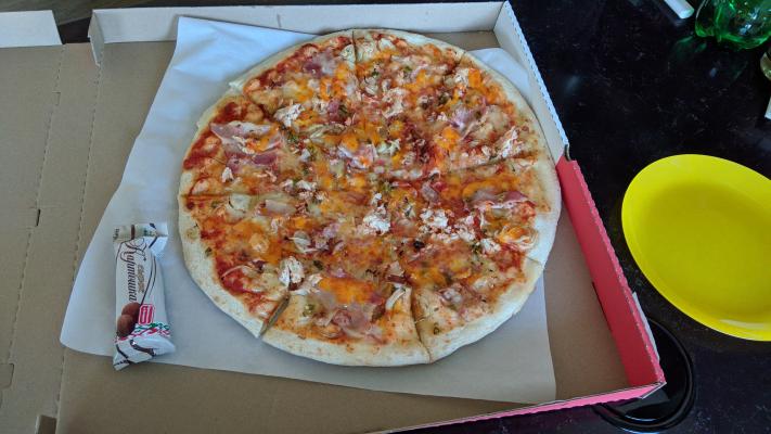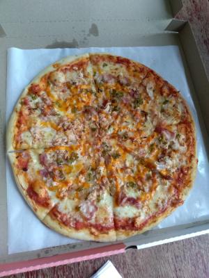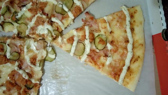Заказывал вчера чикен-бекон. Сама пицца вкусная, без вопросов, по начинке тоже все хорошо. Но ребята, зачем столько лука? В салате оливье, которое готовят в столовых (не ресторанах), и то его меньше. Только за это снял один балл. Персонал вежливый, курьер привез пиццу через один час (плюс-минус).