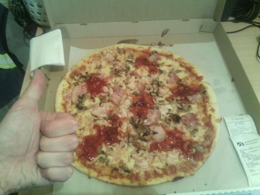 Хороша пицца! Заказал домой с работы и только пришёл уже звонок в дверь — с оператором общался в 17:06, а в 17:45 уже приехал курьер. Горячая, аж пипец ещё была))) Зачёт!