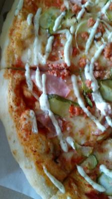 Я, конечно, читала отзывы, и слишком многого не ожидала, но все равно начинки очень мало. Пицца на последнем фото выглядит вроде ничего, но на самом деле после огурцов начинки совсем нет, только тонкий слой сыра с кетчупом.  Тем не менее вкусно, середину съели, края оставили.