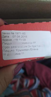 Спасибо огромное за пиццу. Ооочень вкусно! Позвонила очень приятная девушка приняла заказ. Доставка должна была быть через 1 час 15 минут. К приятному удивлению привезли через 50 минут. Горячую, как будто только из печи.... Обязательно буду ещё у Вас заказывать!!!