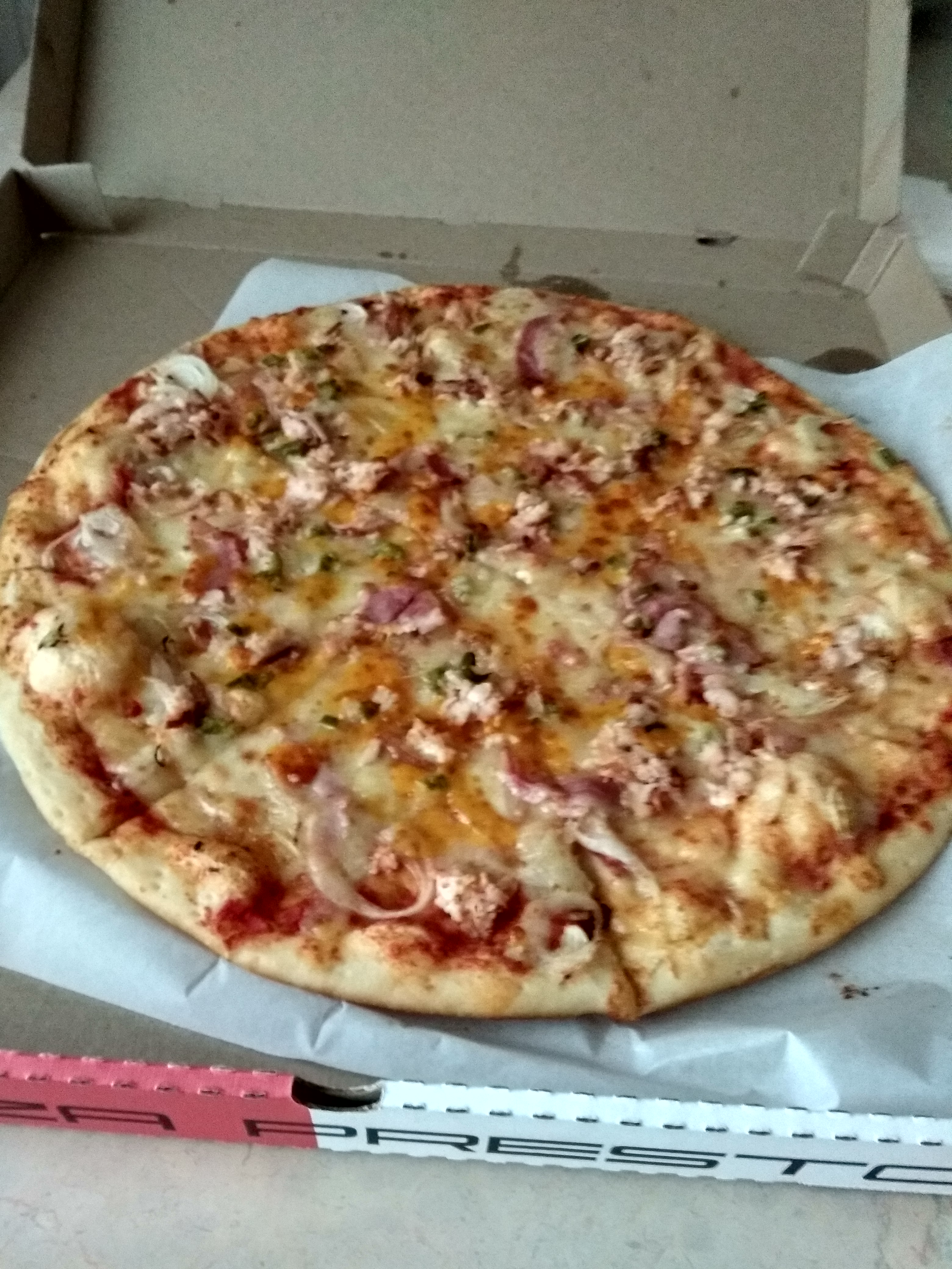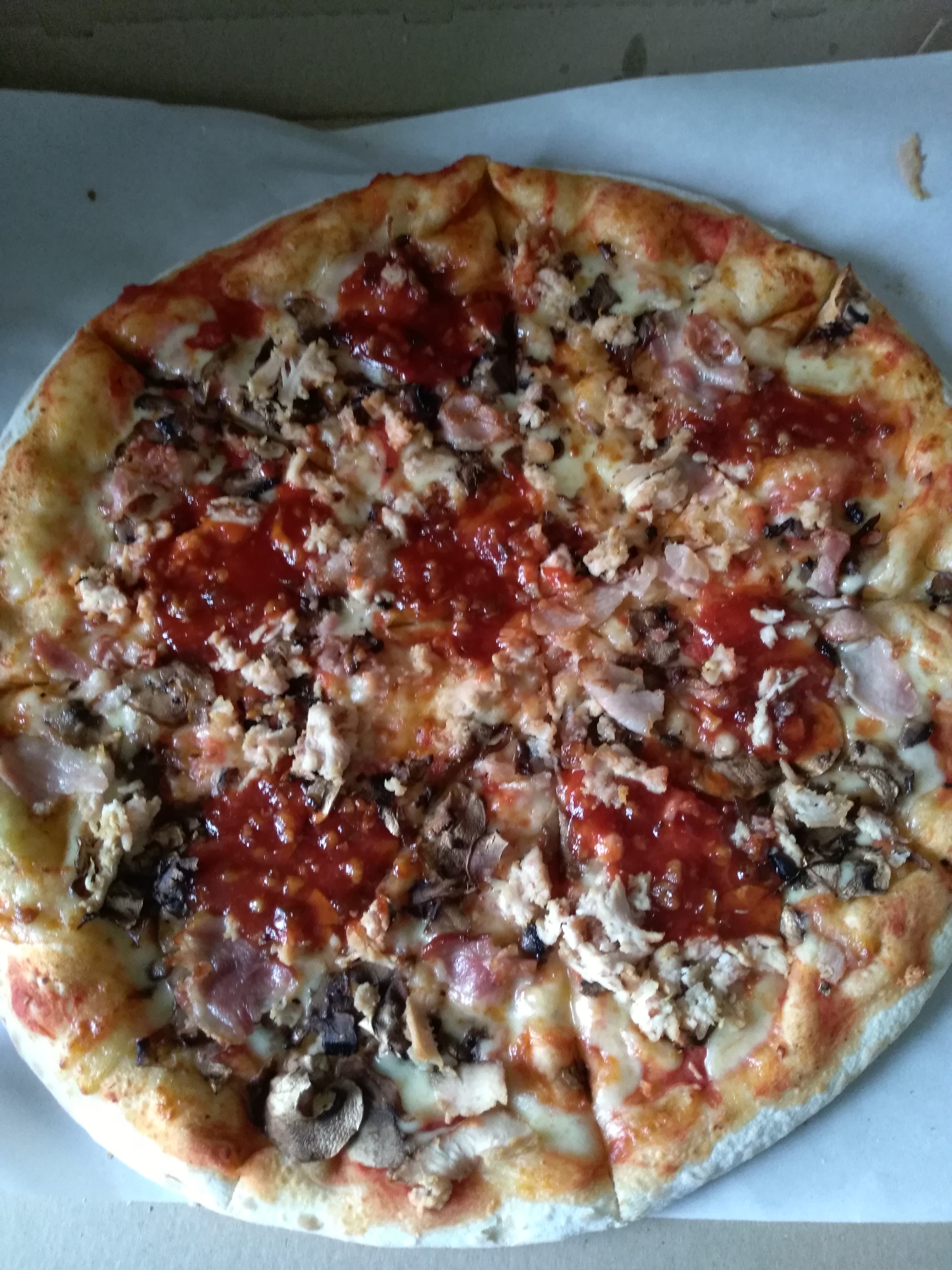 Заказывали пиццу со сладко-острым соусом в обед, чтобы в 18 часов уже вкусно поужинать, но курьер опоздал на 35 минут (пятница, дождь). И итоге пицца холодная, пришлось пользоваться микроволновкой. Хотелось бы, чтобы начинка была более равномерно распределена по пицце и ее было немножко больше.
