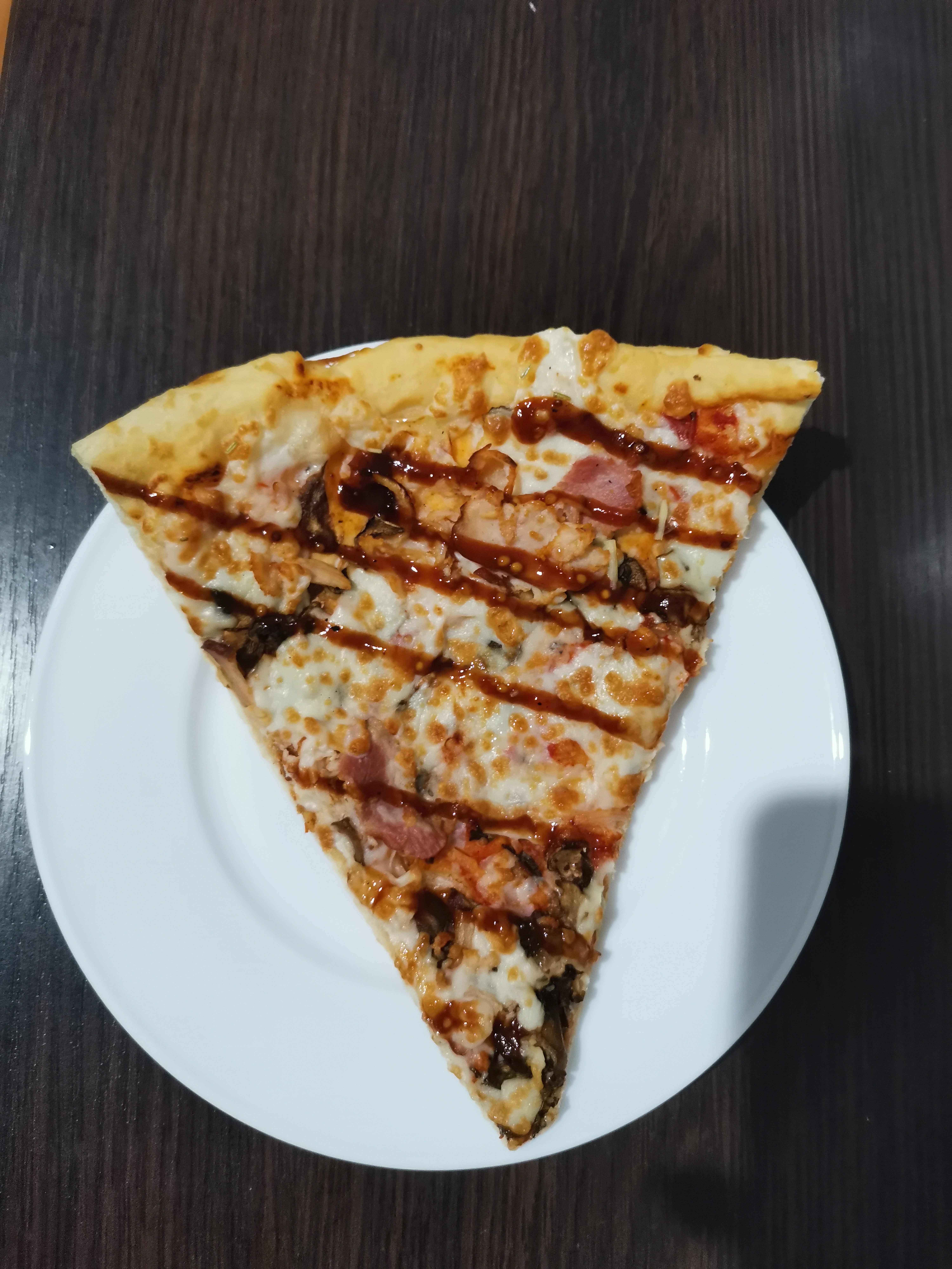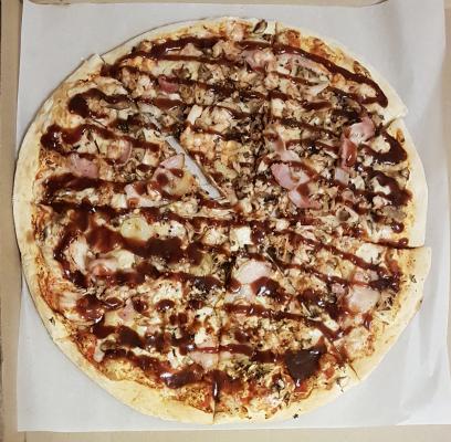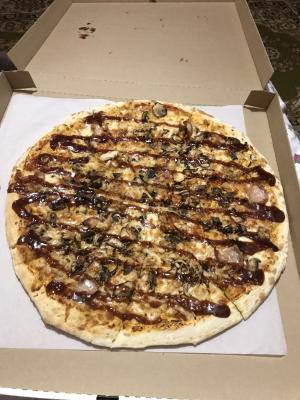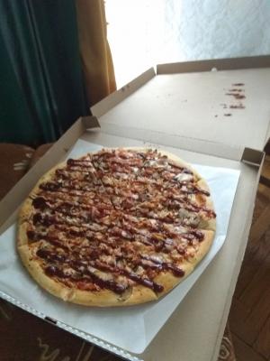 Пицца барбекю крутая, очень большая и сытная. Стоит своих денег.  Доставка в течение часа. Нам понравилось очень.