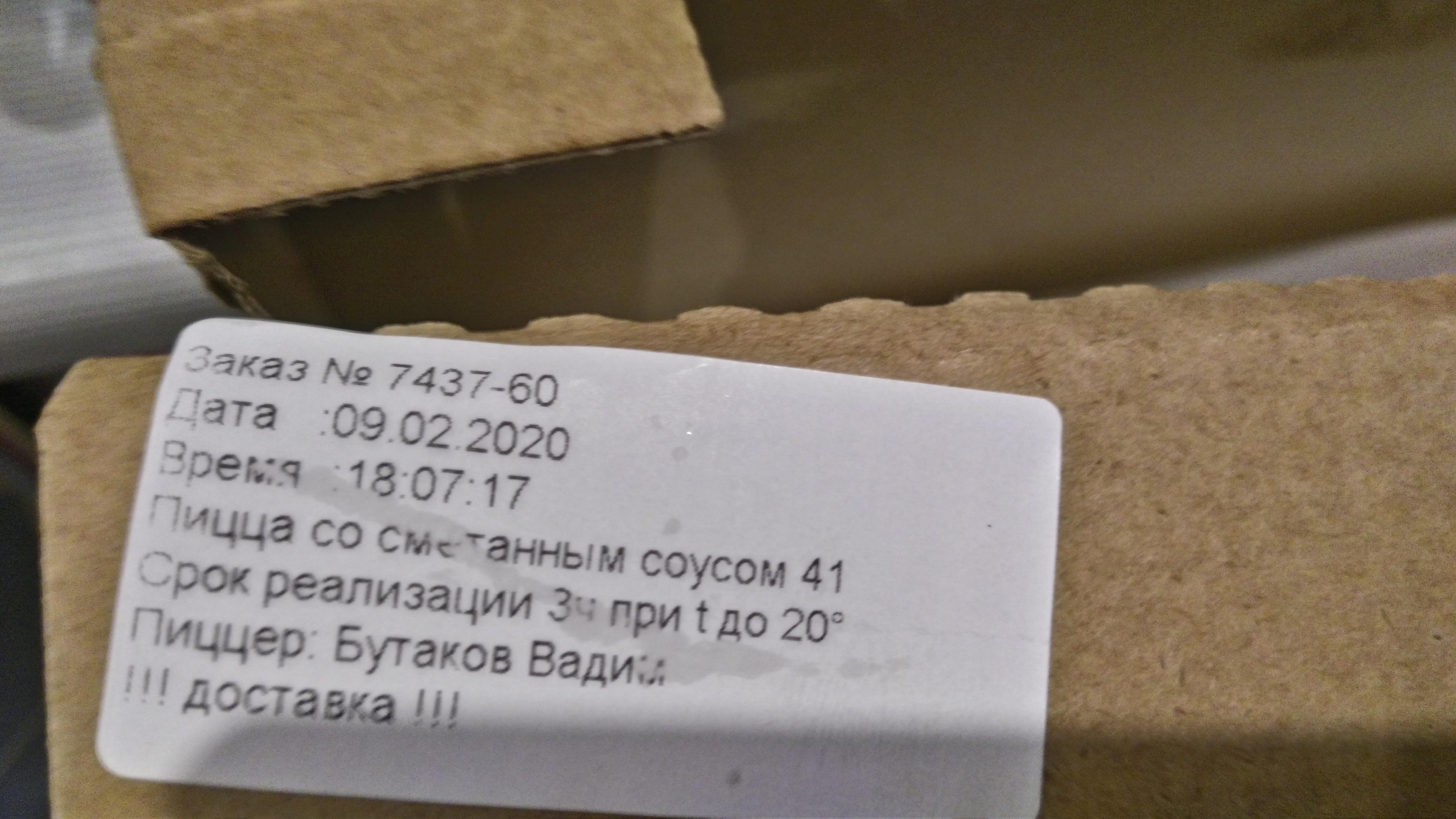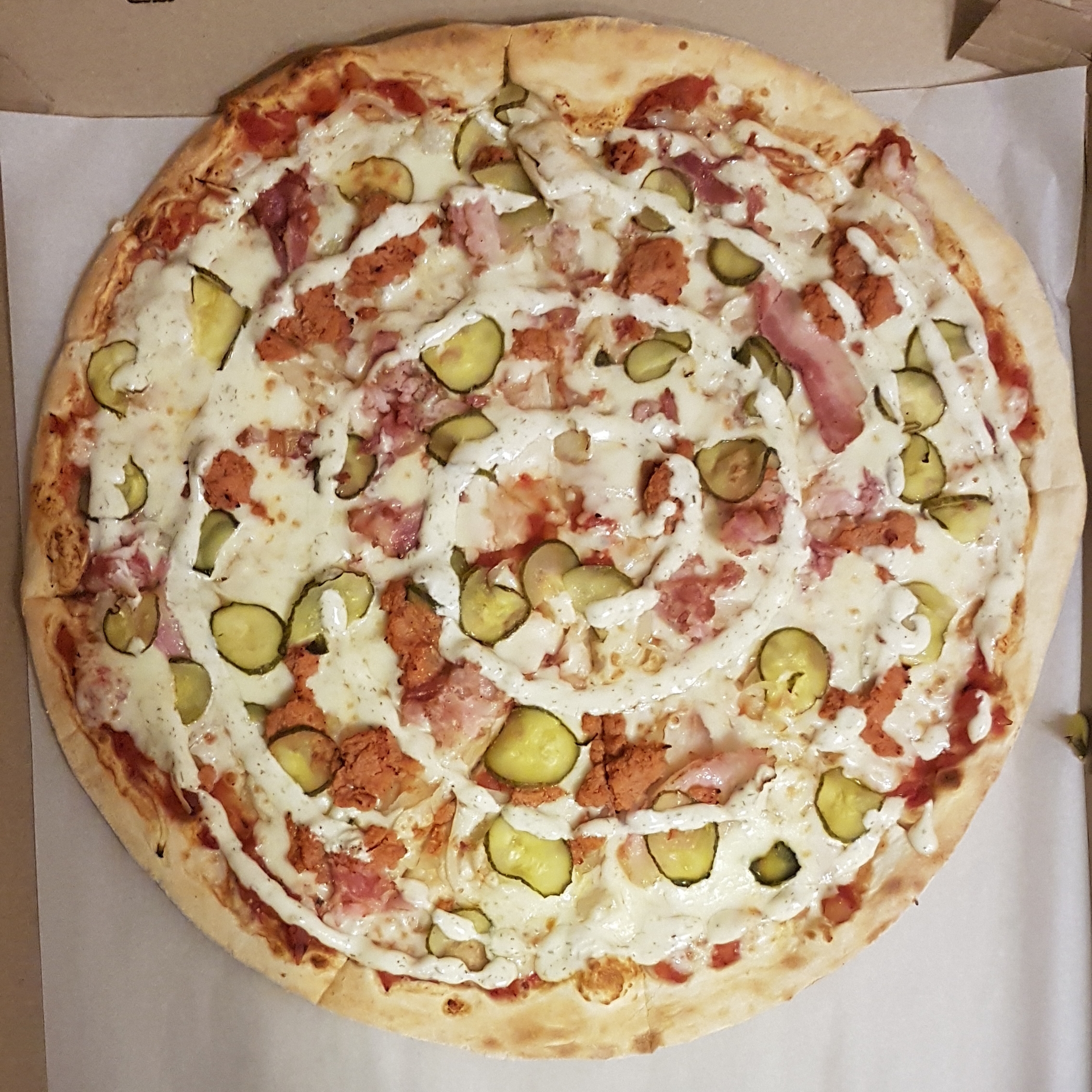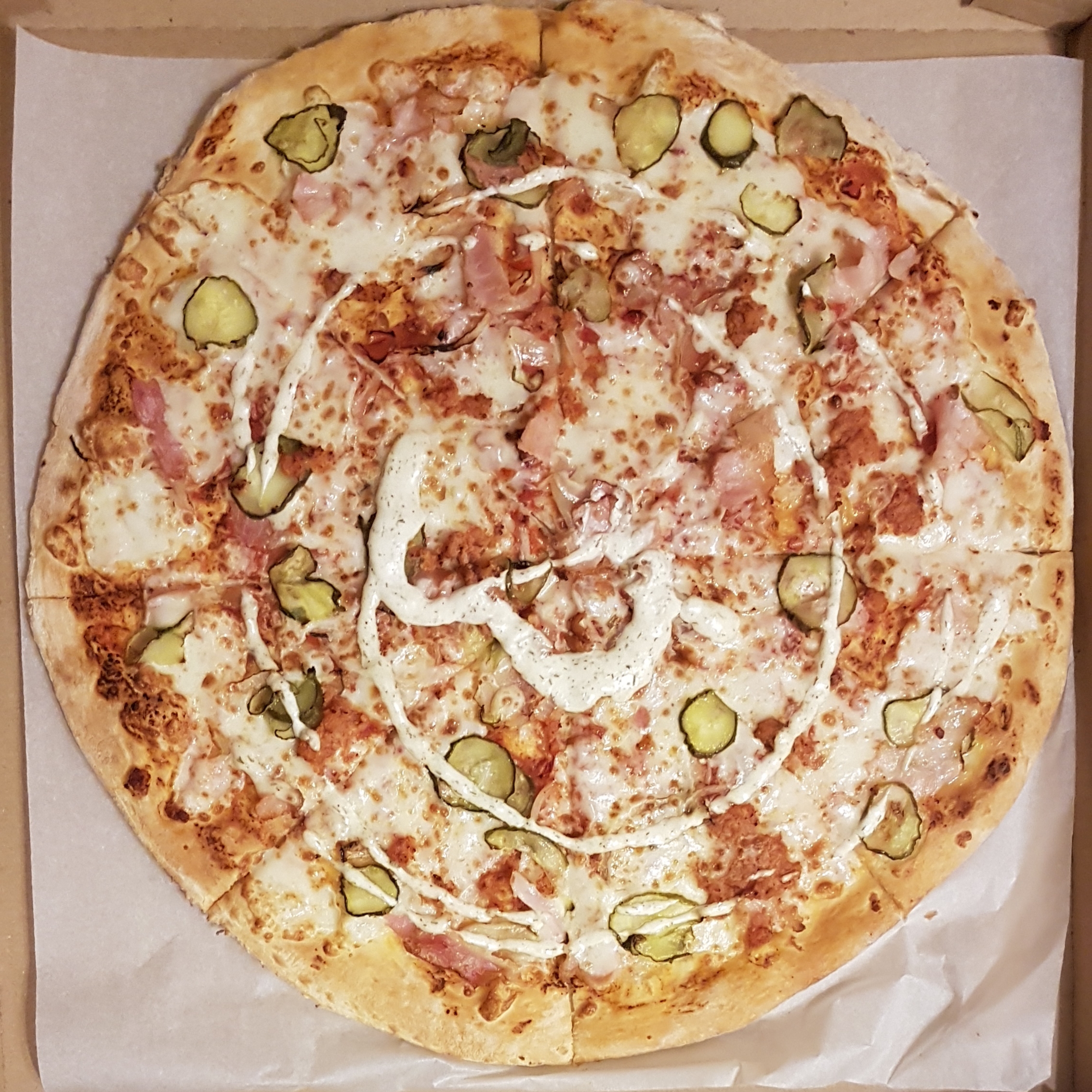 Спасибо пиццеру за вкусную и курьеру за вовремя доставленную пиццу со сметанным соусом. Вчера впервые попробовали в ТЦ, сегодня заказали по акции. Хотелось бы соуса на каждом куске, но, видимо, по рецепту не положено. Однозначно будем заказывать ещё.