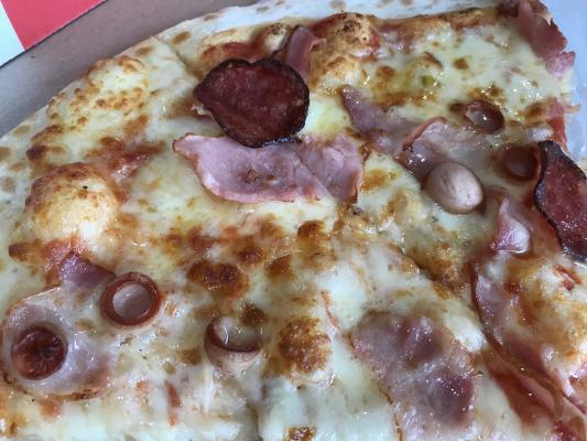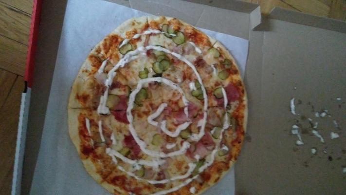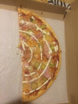 Пиццу доставили за 1 час 1О мин. По весу все норм,но немного постноватая. (Пармскую брали).