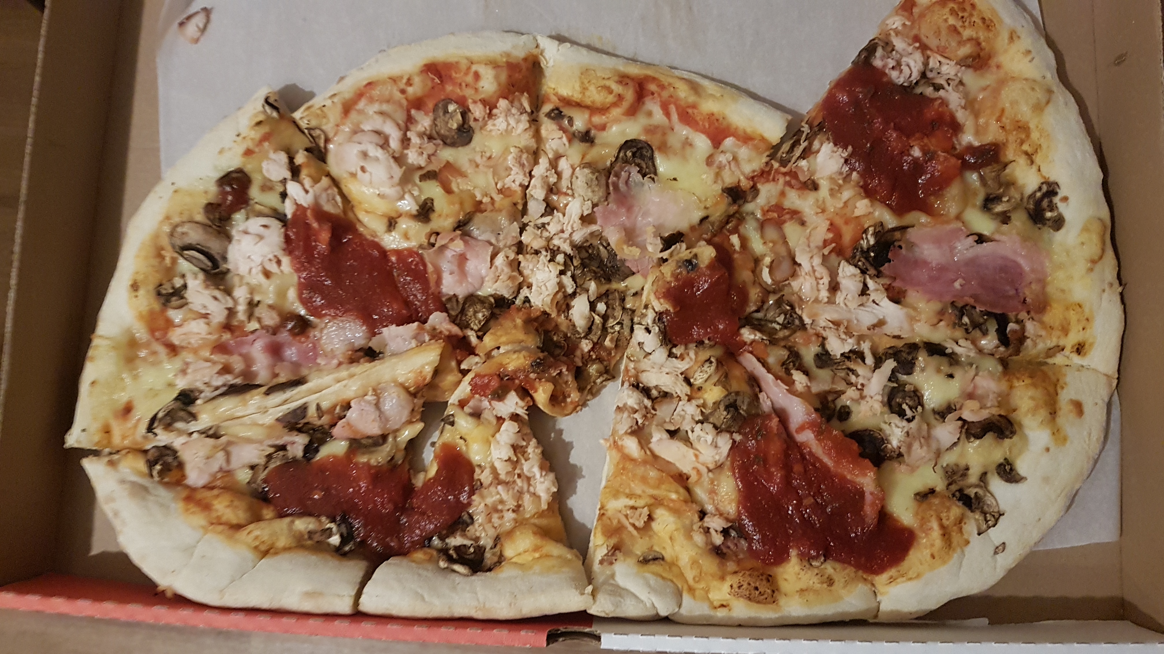 На удивление в этот раз привезли отличную пиццу, начинки не пожалели, бортов не было, доставили за час.