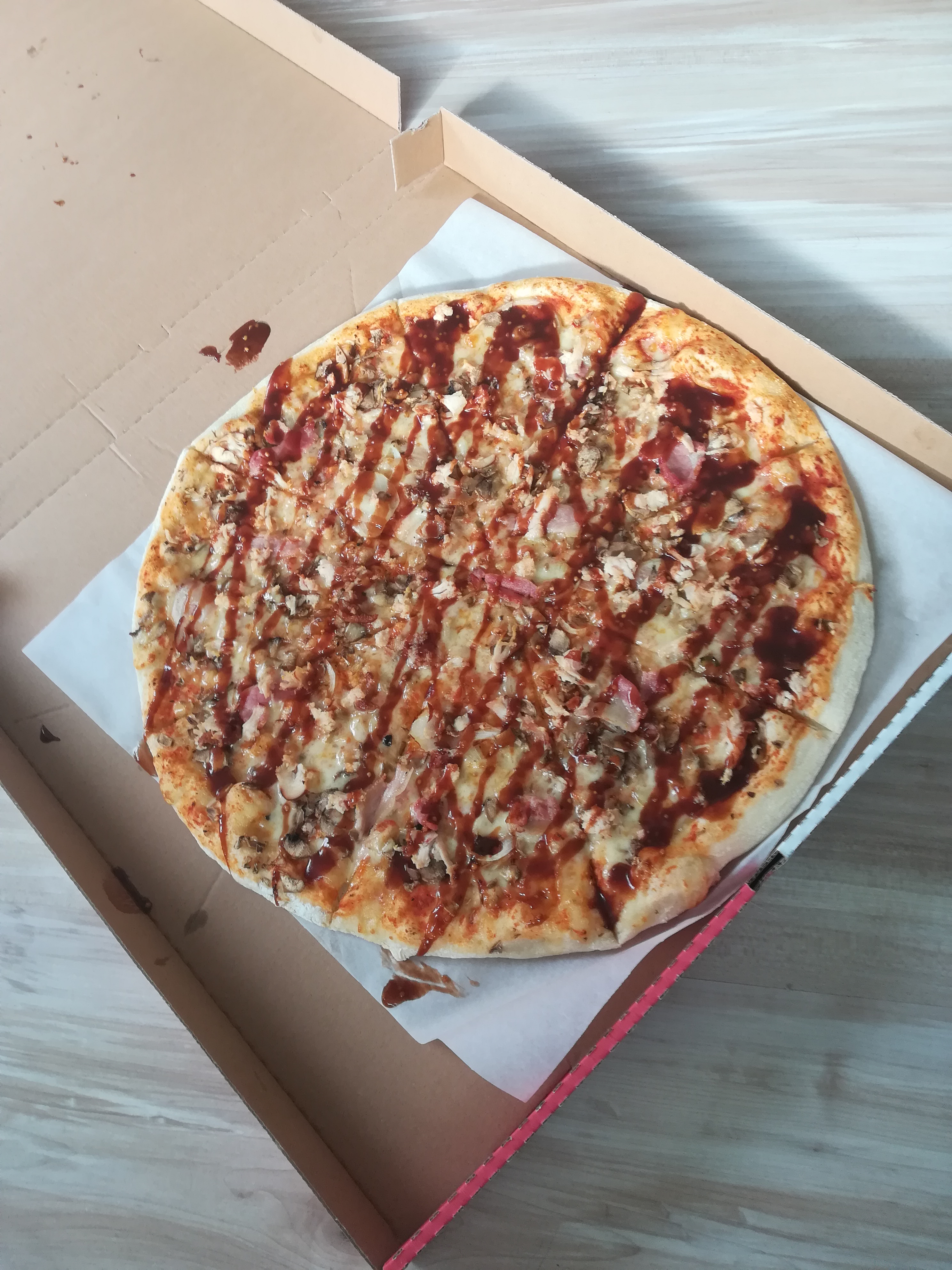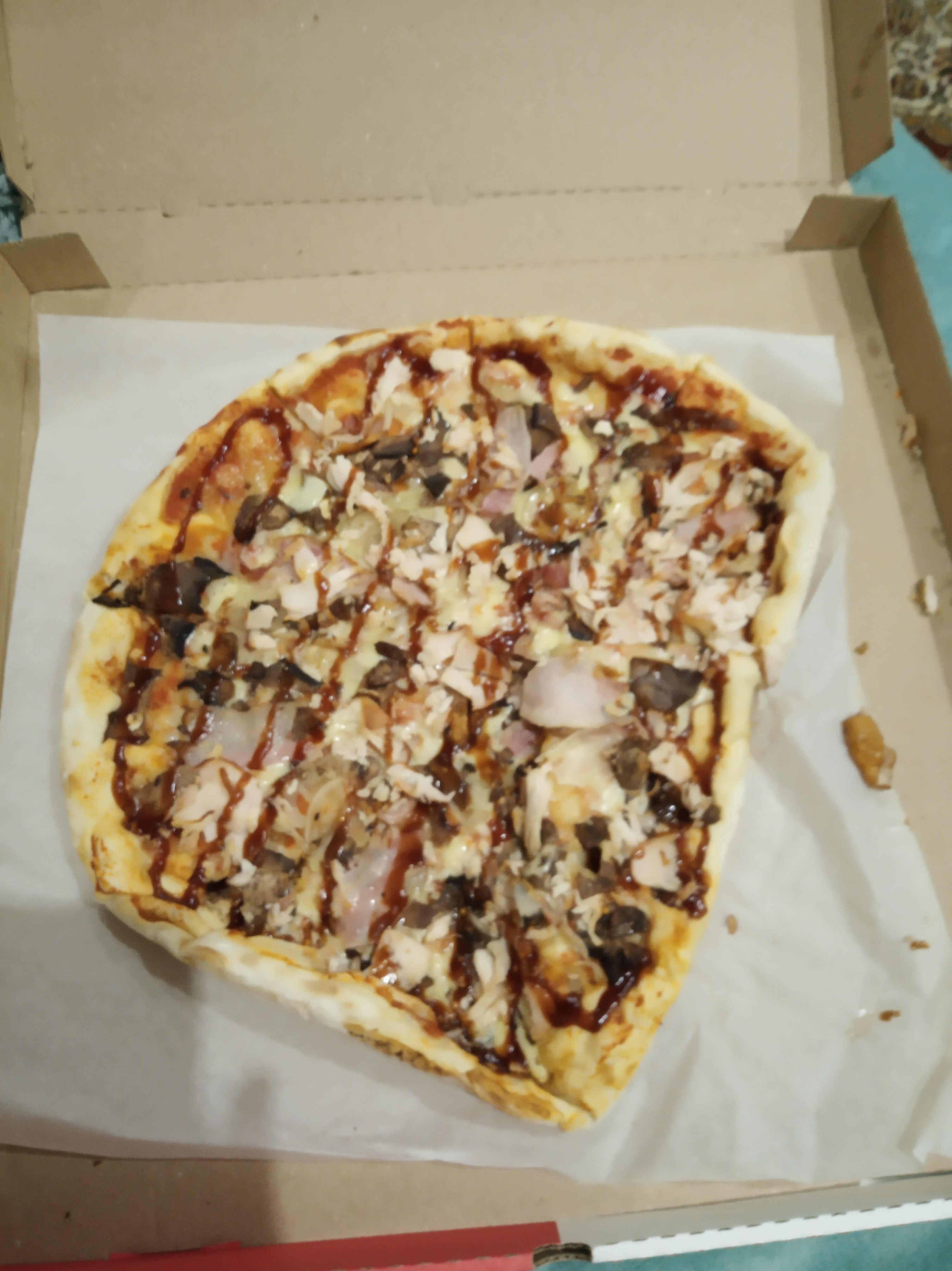 Заказывали 2 пиццы по акции: Барбекью и Гавайи.  Были разочарованы. Тесто резиновое,  сухое,  приходилось запивать.