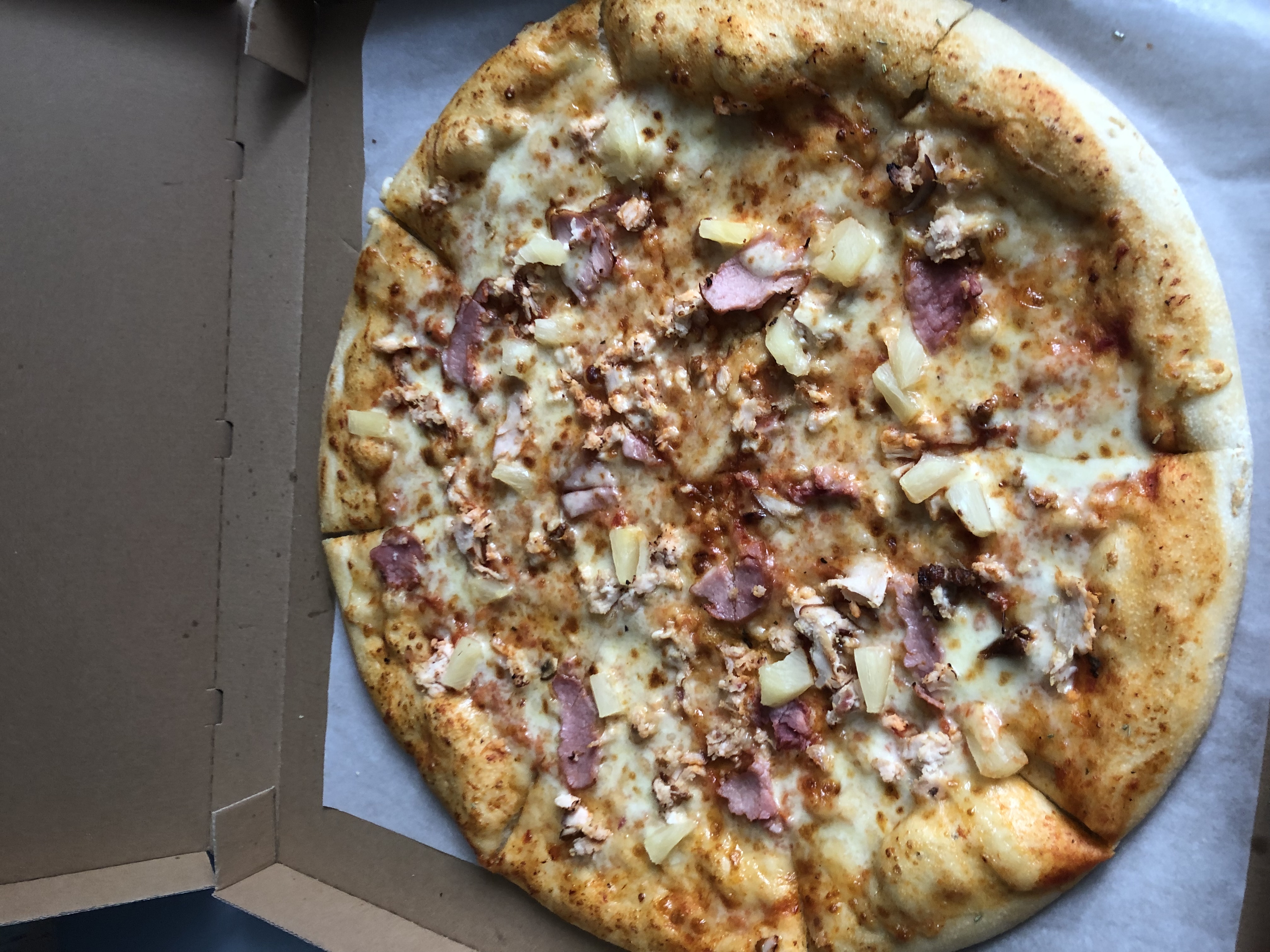 Гавайи- тесто потолще, положили пару кусков ананаса, курицы и немного ветчины, а вот сыра не пожалели.