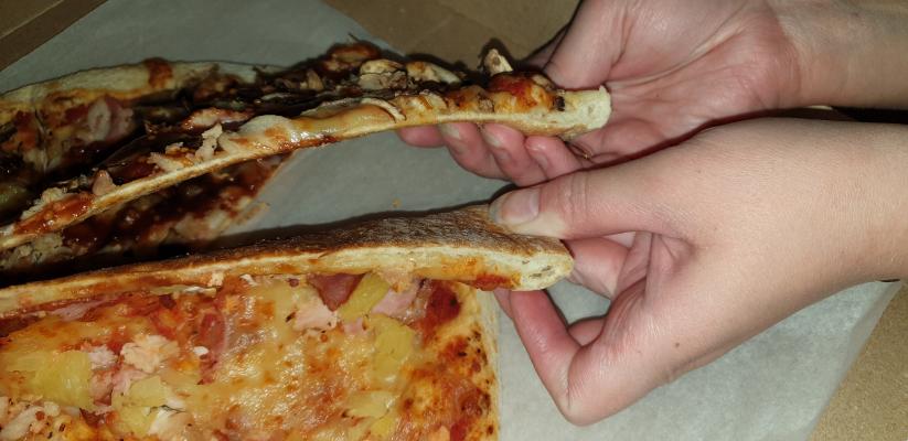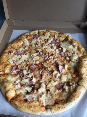 Заказывали пиццу Гавайи. Ну такая..Тесто толстое и жесткое, очень большой отступ начинки от края, да и вообще в основном тесто с сыром (