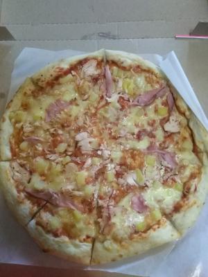 Заказывали сегодня Гавайскую пиццу. Пицца вкусная. Диаметр меньше заявленного, зато начинка равномерно распределена.