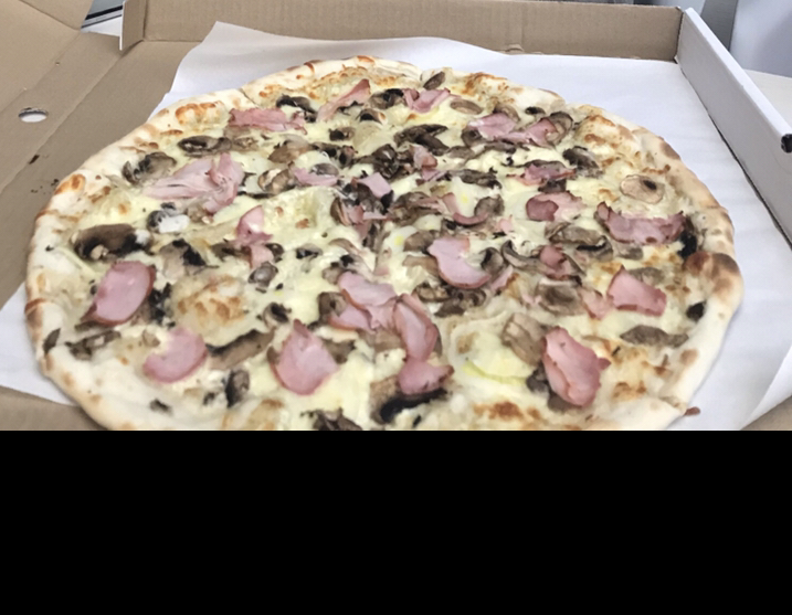 Сливки, сыр моцарелла, лук, шампиньоны, бекон, ветчина и курица.