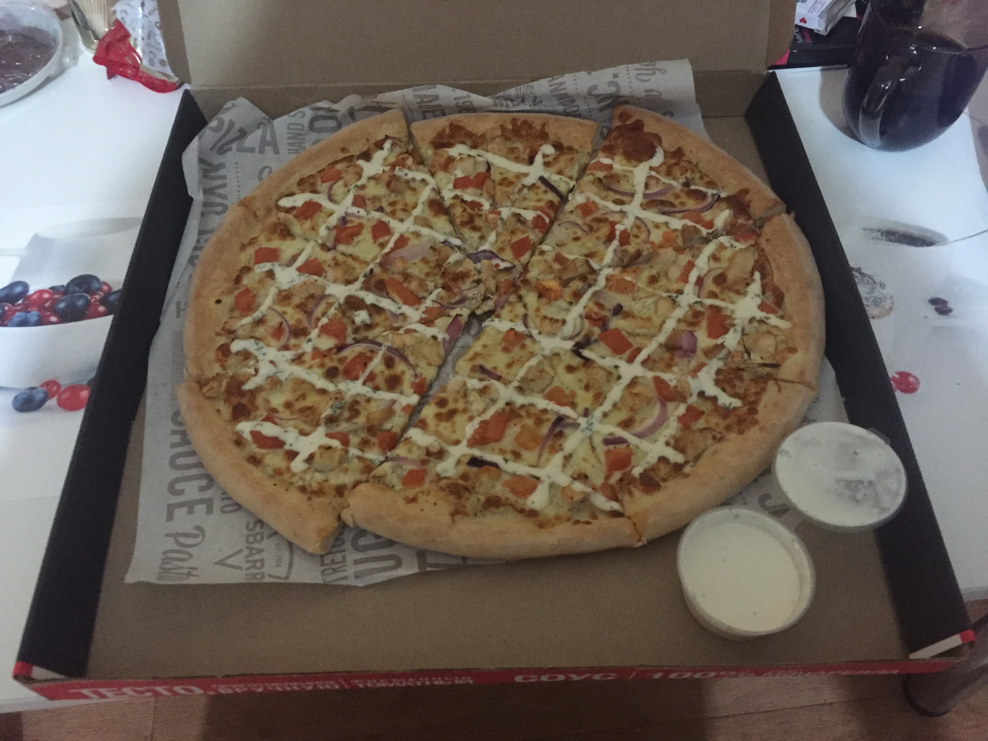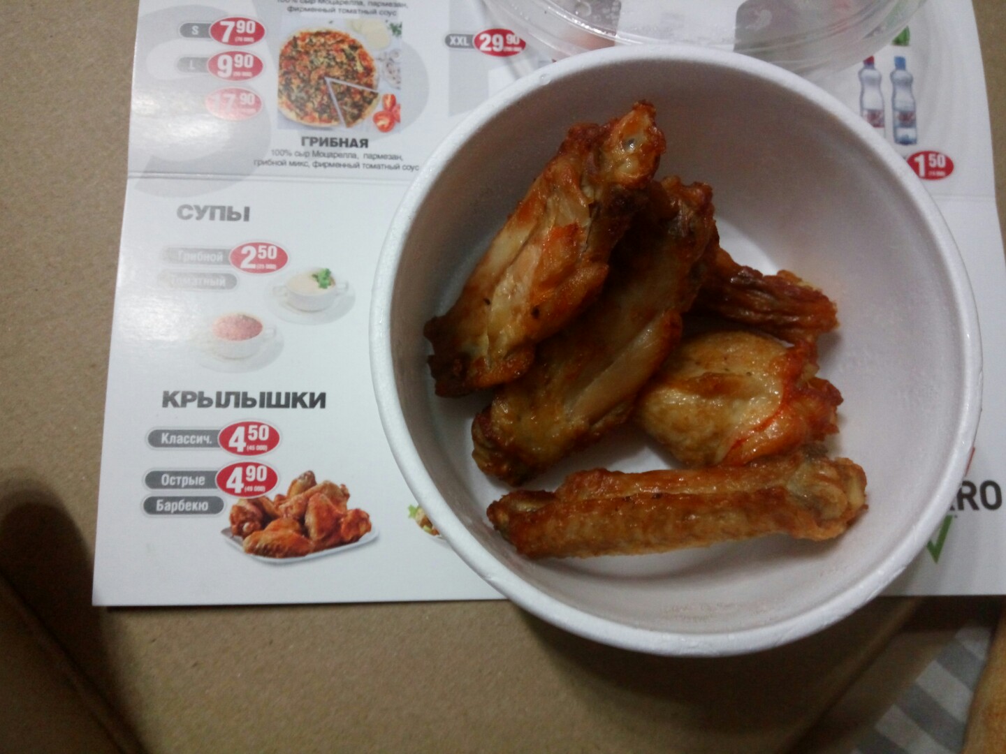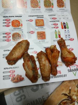 Пицца большая, в принципе ничего такое. Курица по краям, по центру пару кусочков - в основном тесто соус и лук. Наверное для сливок экономят, думаю в Нтю Йорке им бы предложили отнести ее на кухню обратно) А для РБ и сливок пойдет) Для доставки дозаказали крылья. Люблю я их очень. Но это жесть)) На фото видно - сухие, как будто им лет сто. И конечно количество и внешний вид налицо. По вкусу - еще хуже. Итого - по пицце - действительно большая, начинки почти нет - но в 2 наелись, крылья дикий ужас. Чтобы дешево покормиться пойдет - а чтобы приятно провести вечер, лучше чтото другое. Доставка вовремя. Желудки набили))