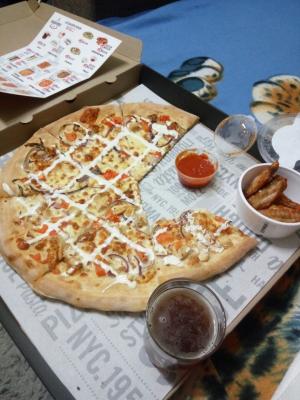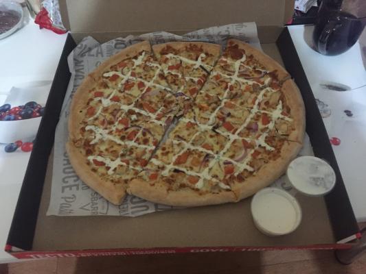 Пицца не плохая, тесто толстовато на мой вкус, но соус супер вкусный. Сама курица немного сухая и пресновата, но соус спасает ситуацию) Доставили в срок, теплой, курьер вежливый. Наверное, буду заказывать еще.