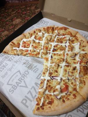 Прочитав отзывы и видя наличие спроса, купила 2 промокода. Заказала одну, привезли через час, хотя идти до ближайшего SBARRO 5 минут. Немного теплая. И ООООчень невкусная - сплошная булка, к тому же какая-то резиновая, сыра практически нет, ничего почти нет, только видны куски курицы, Сухая пицца, которая не лезла в горло, и по вкусу - никакая. Пришлось как-то ее наполнить - колбасу, сыр, приправы, соус. Кое-как за 2 дня съели. Никогда не ела такую невкусную пиццу.