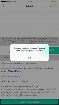 - Также промокод дает право на скидку 30% на пиццу (43 см) "Диабло" и "Вегетарианская"от "Sbarro".