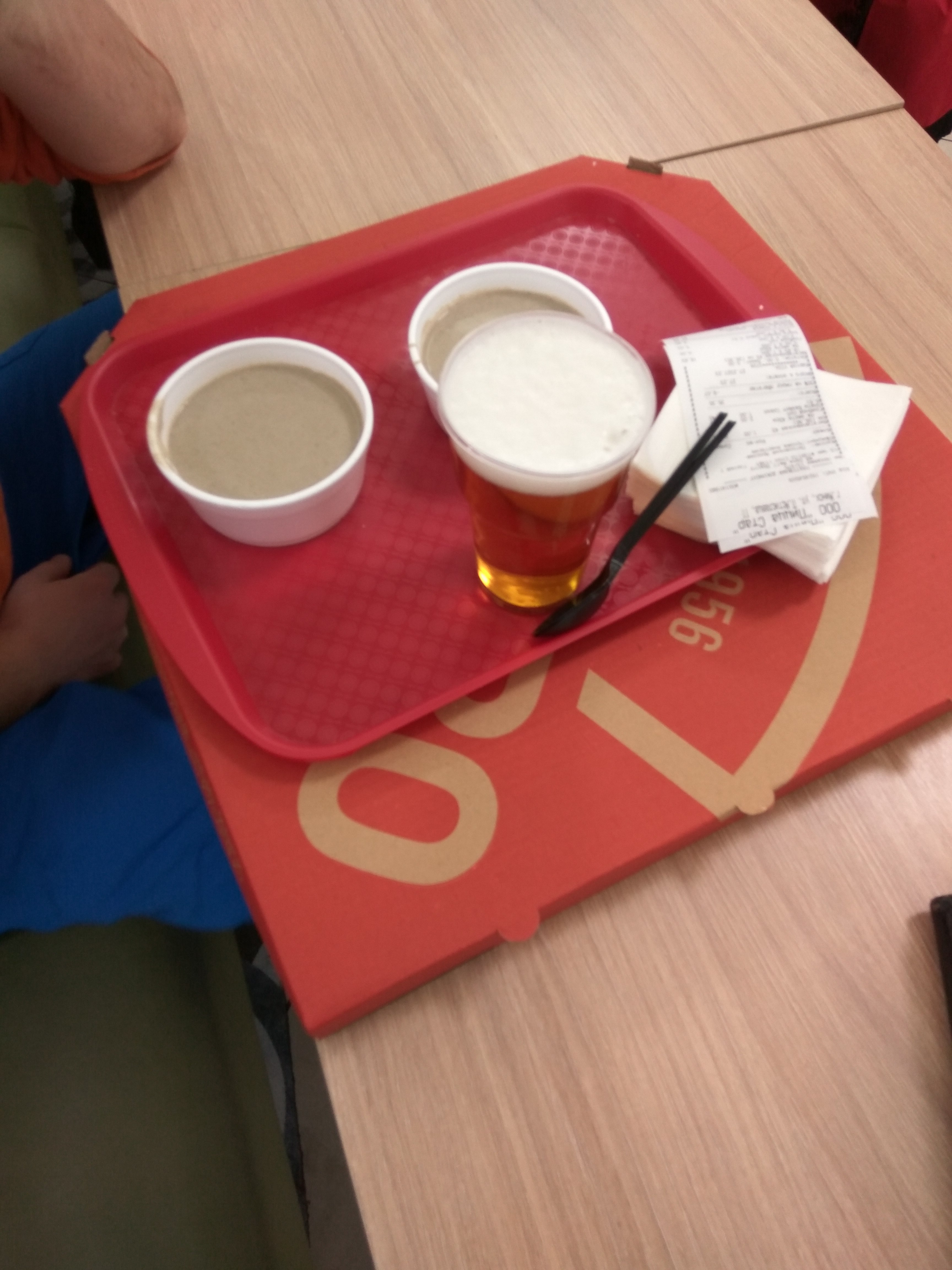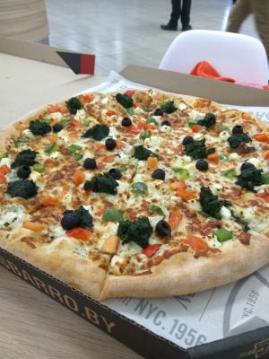 Пицца огромная ,вкусная. Брали на самовывоз поэтому горячая. Начинки более чем достаточно, но она на любителя: лично я не люблю оливки и шпинат, и перец зелёный был так себе. В общем довольны обслуживанием и едой. Пиво и грибной супчик тоже вкусные. Пиццу сделали быстро 20мин.