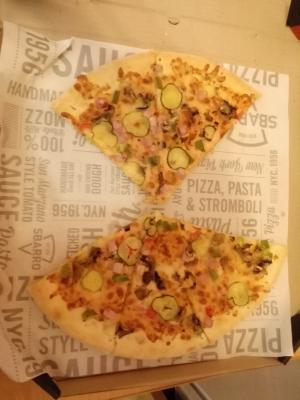Решили воспользоваться данной акцией у любимой пиццерии Sbarro. Пиццу привезли через 1,5 часа. Заказали Горчичную пиццу и пришли в ужас!!! По внешнему виду уже было понятно, что пицца не свежая (все кусочки заветренные, перец сморщеный и т.д.), но рискнули и съели по кусочку, о чем позже пожалели. Пиццу ели на ужин и кроме нее ничего в пищу не употребляли, ночью стало плохо (отравление). Пицца по сливкам кардинально отличается и по внешним данным и по вкусу от пиццы, которую приходишь и кушаешь на месте в ресторане (кусочки). Поэтому очень разочаровались в Sbarro с таким отношением. И больше не будем заказывать и посещать некогда любимое заведение!