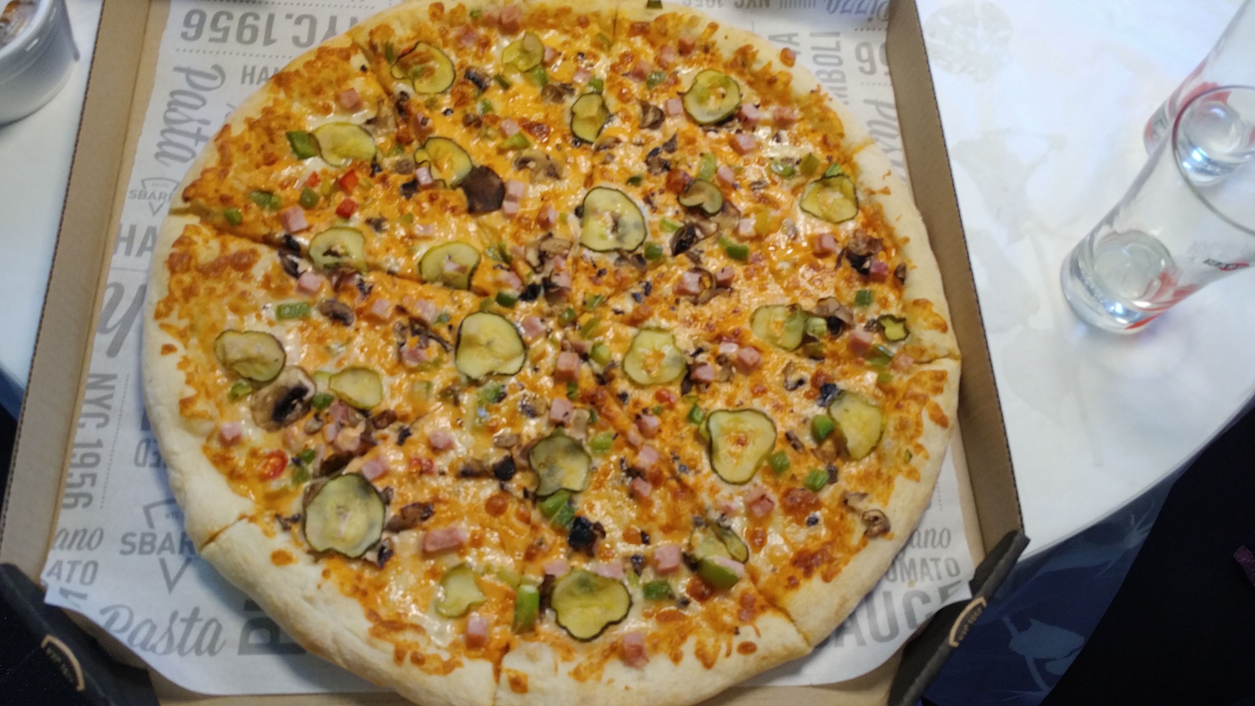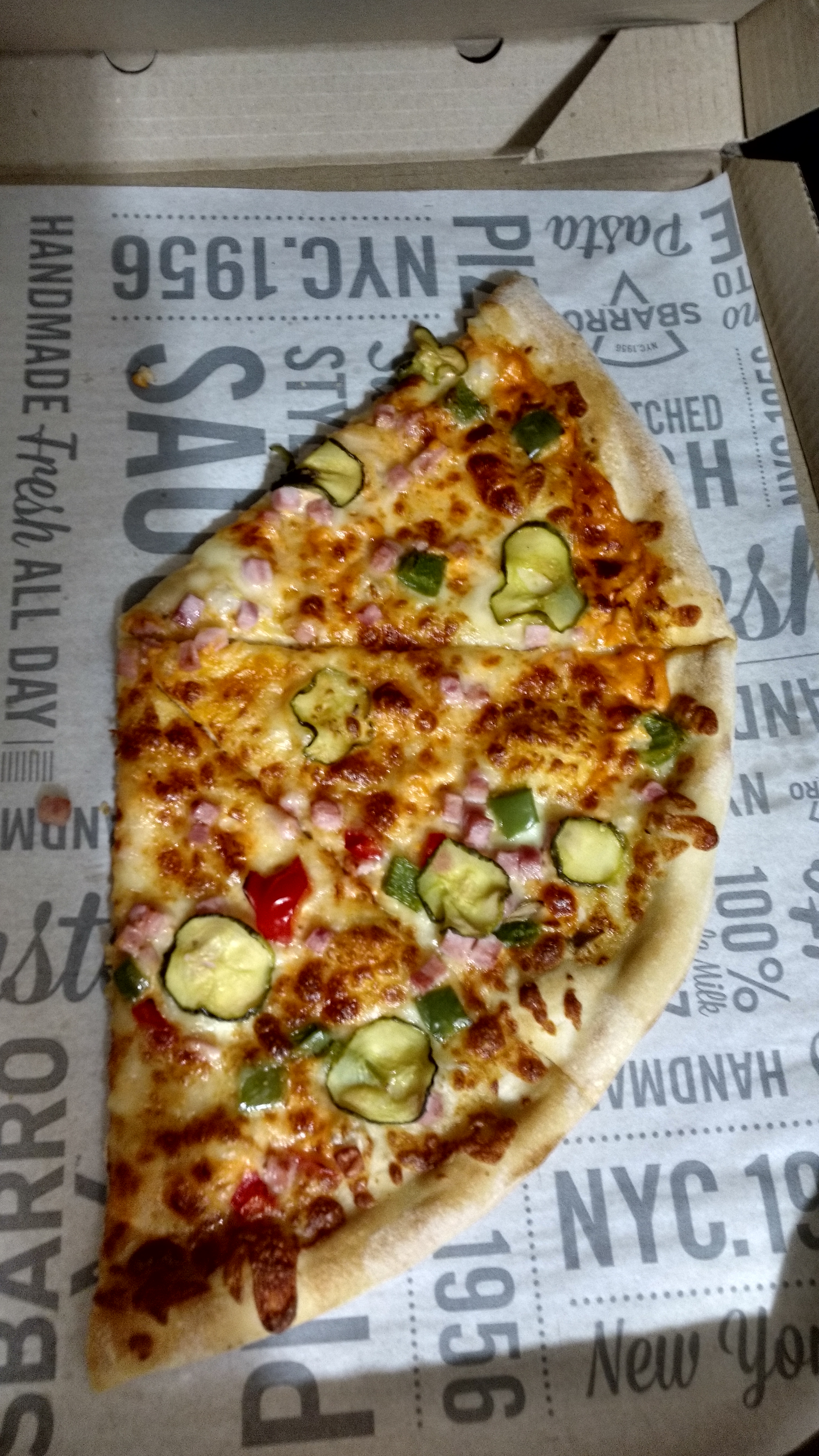 Воспользовались скидкой вчера 11.01.2018. Брали на вынос "Ветчина с грибами" в ТЦ "Спектр" (ст.м. "Уручье"). Заказали, оплатили, походили по ТЦ минут 15 и вернулись забрать. Очень понравилось: вкусно и много.