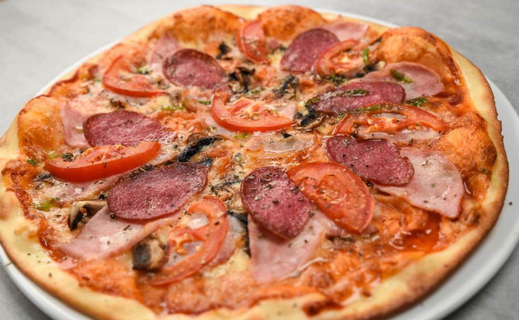Состав: тесто, сыр моцарелла, колбаса с/к, ветчина, грудинка к/в, болгарский перец, томаты, шампиньоны.