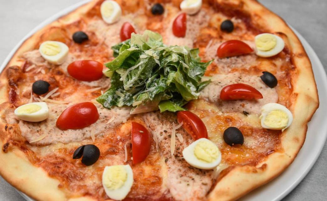 Состав: тесто, сыр моцарелла, пармезан, куриное филе, перепелиное яйцо, салат ромен, соус цезарь.