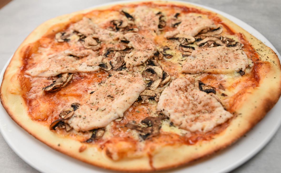 Состав: тесто, сыр моцарелла, шампиньоны, куриное филе, перец чили (в небольшом количестве).
