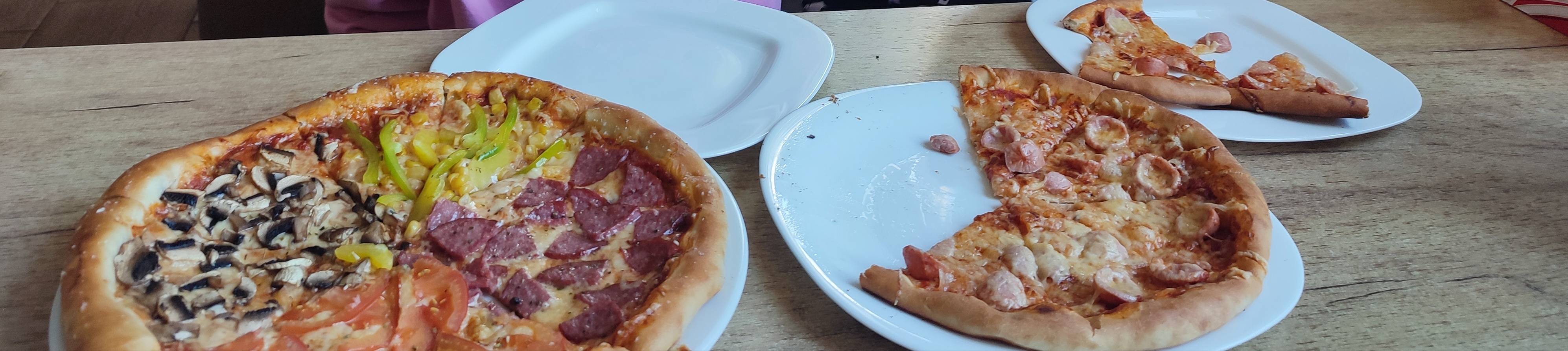 Состав пиццы: тесто, соус томатный, сосиски, кетчуп, сыр, зелень, специи