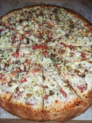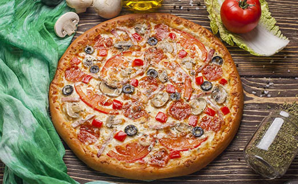 Состав: пепперони, окорок, шампиньоны, маслины, помидоры, сладкий перец, сыр "Моцарелла", соус "Маджорио", орегано.