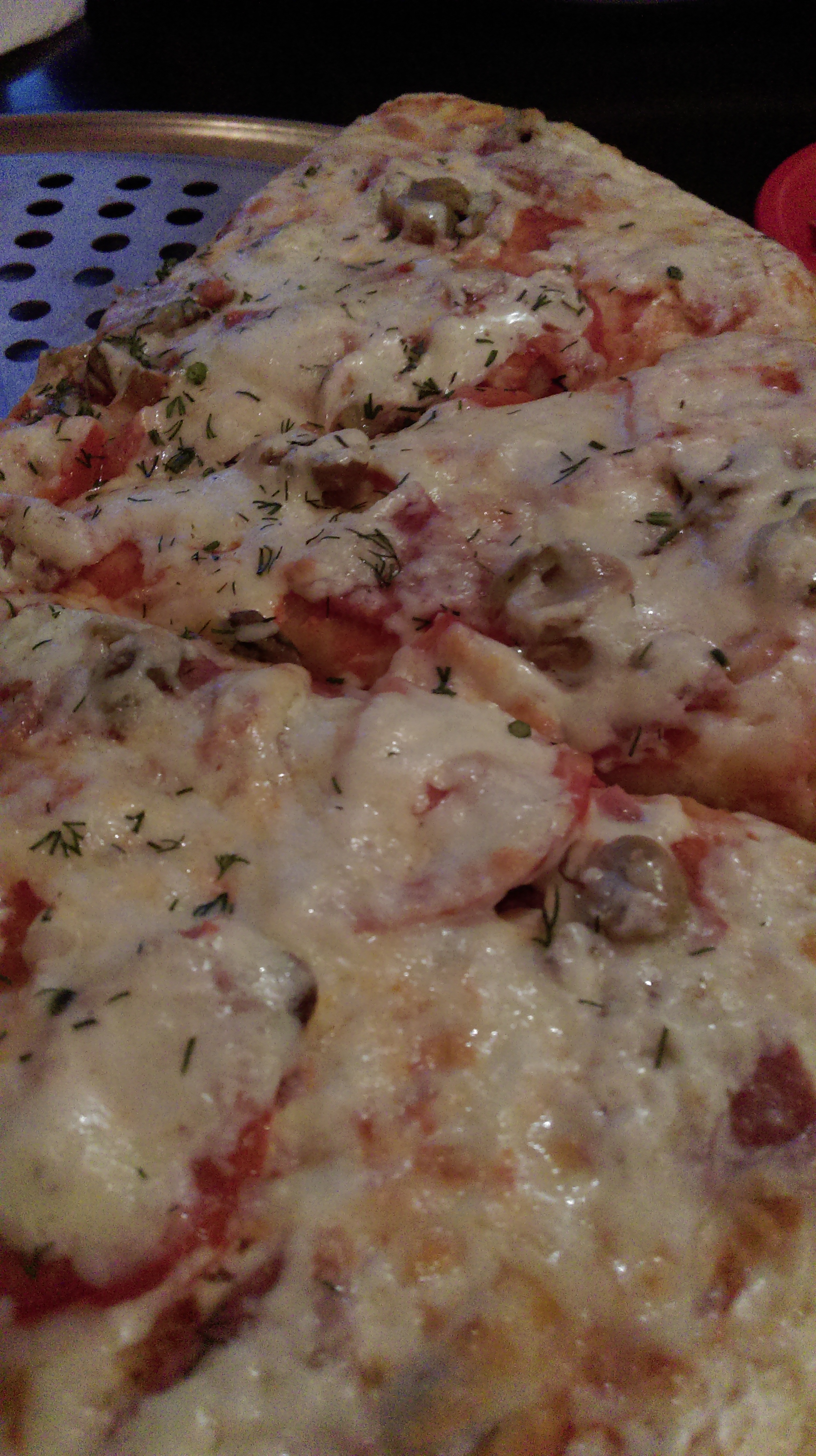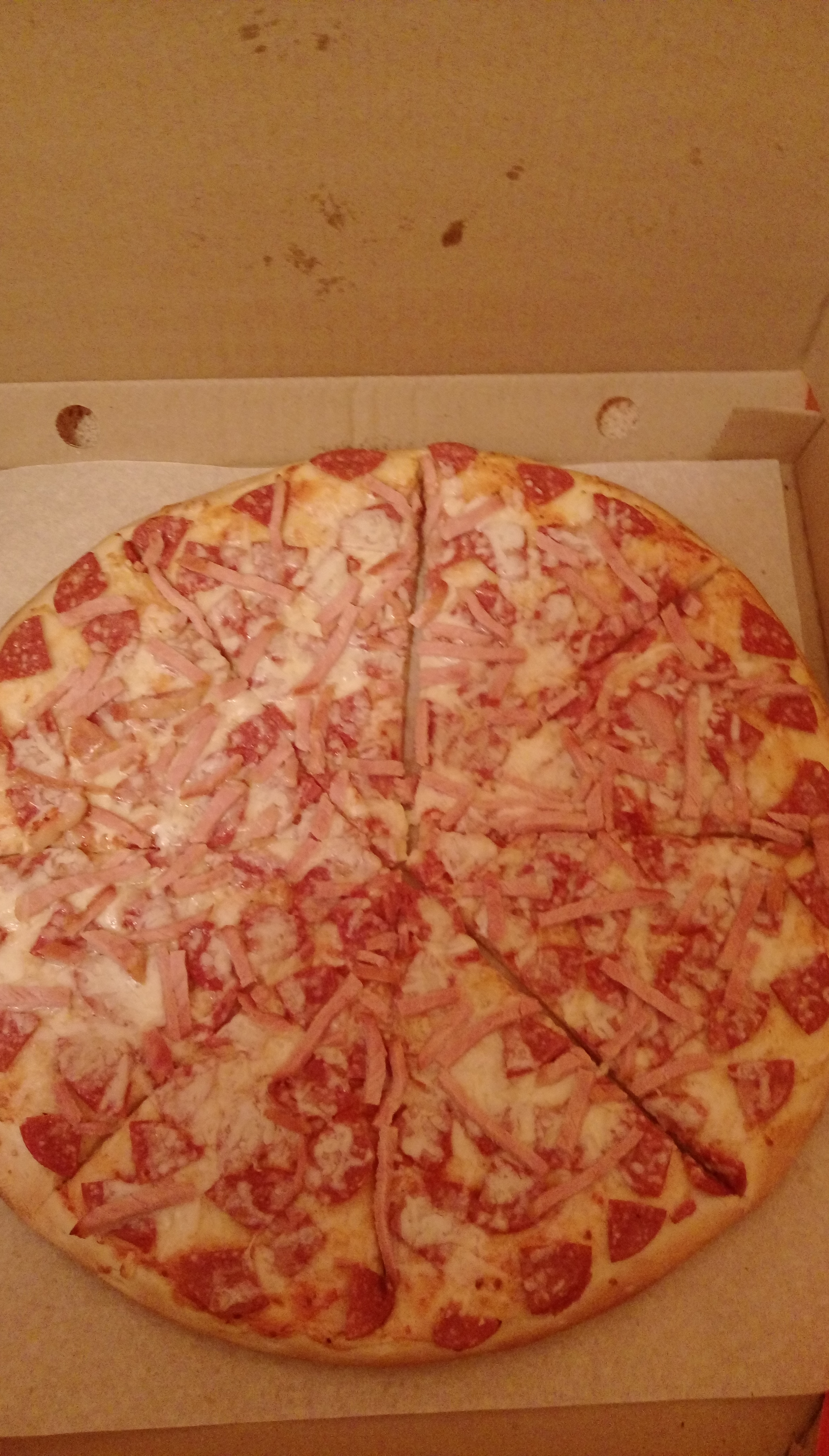 Состав: сервелат, ветчина, пепперони, бекон, сыр Моцарелла, соус томатный, маслины)