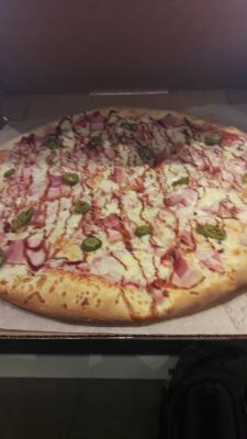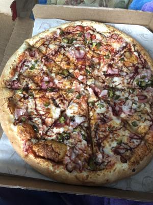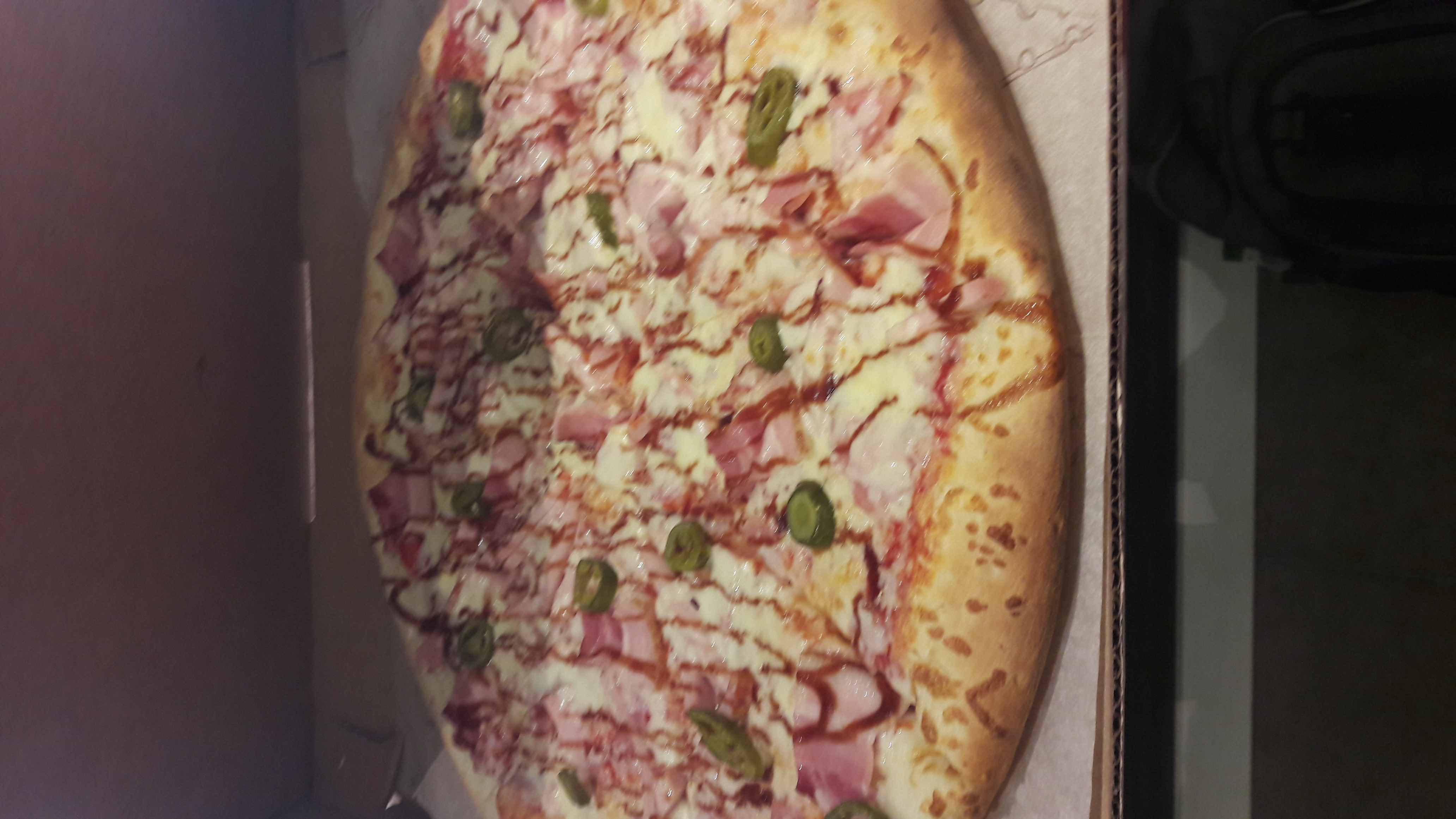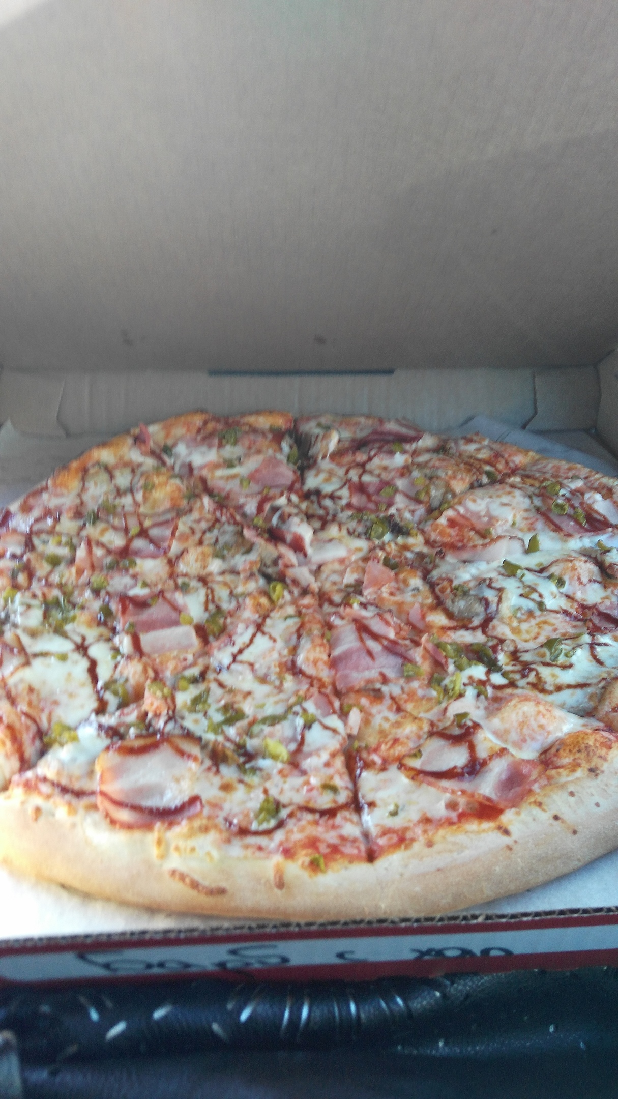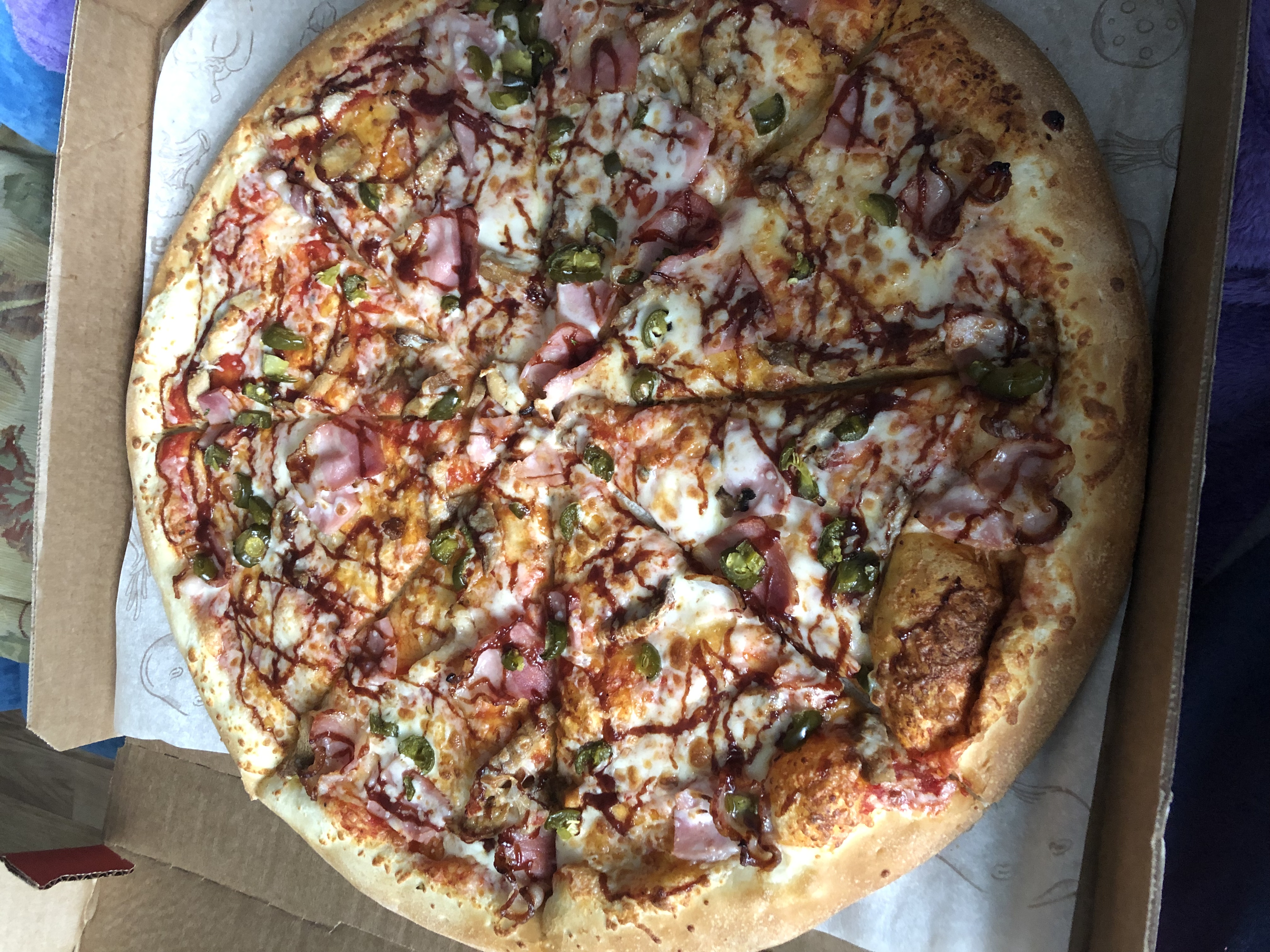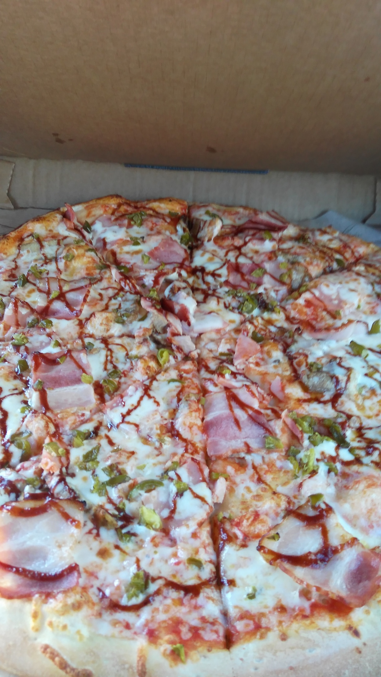 Брал большую пиццу «Барбекю с халапеньо». Со скидкой 40% по промокоду. На Пономаренко. Сказали ждать 15 минут. Через 10 минут уже топал с пиццой в руках! Очень приятная девушка на кассе, которая знала лучше меня какую пиццу я хочу. 😂 Потому что сам реально не знал, что выбрать. Помогла определиться, за это большое спасибо! Пицца очень вкусная и сытная! Прямо удивились с женой! Поужинали и два куска взял на работу на обед. Съел даже холодную - все равно топ! И толстое тесто только красит пиццу. Без шуток! Советую!